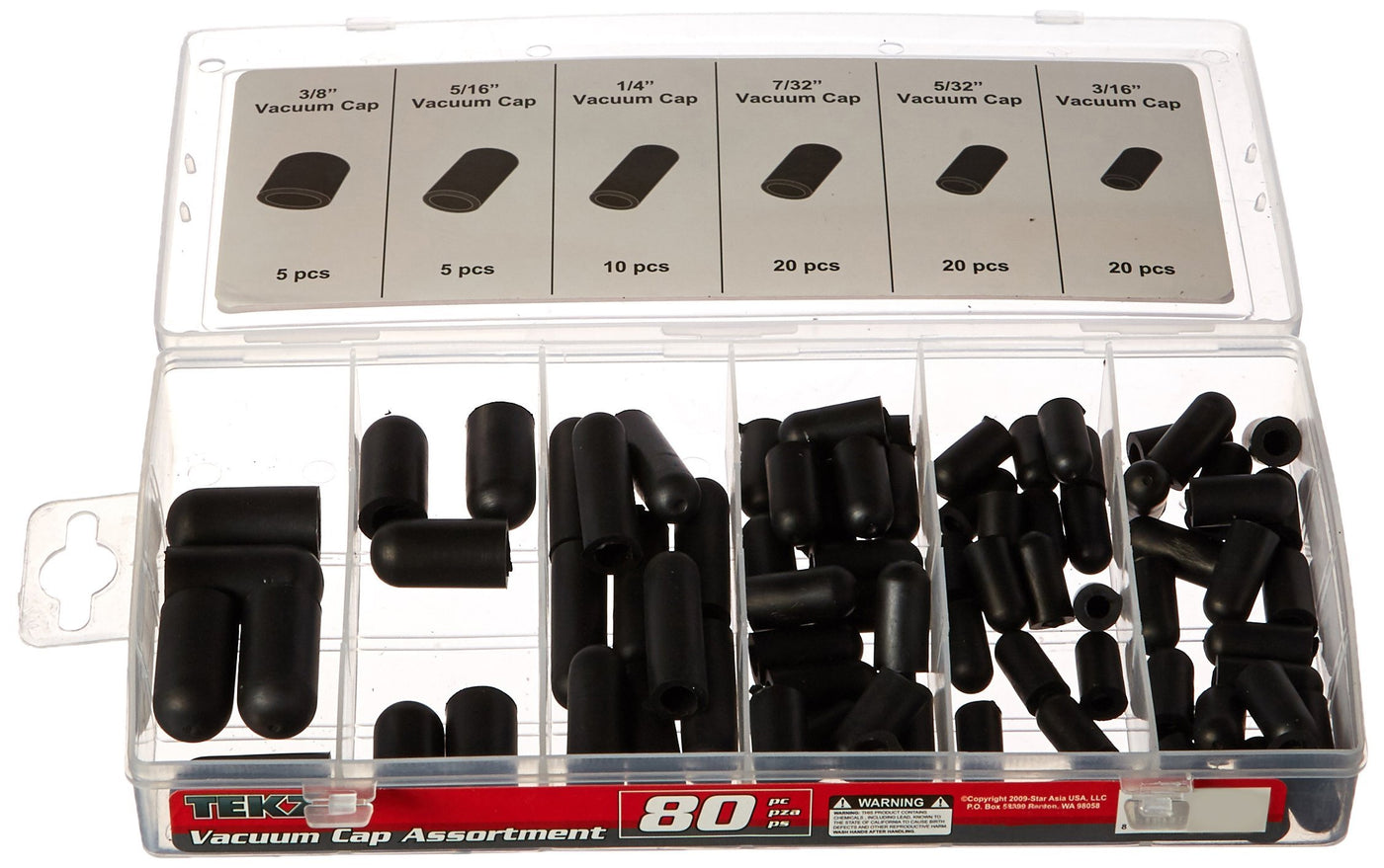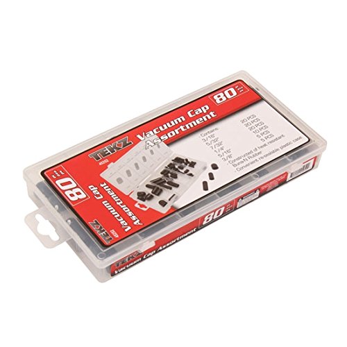 Tekz 45252 80-Piece Vacuum Cap Assortment contains the most frequently used vacuum caps. Caps are constructed of heat resistant buna-n rubber. Includes a convenient resealable plastic case.