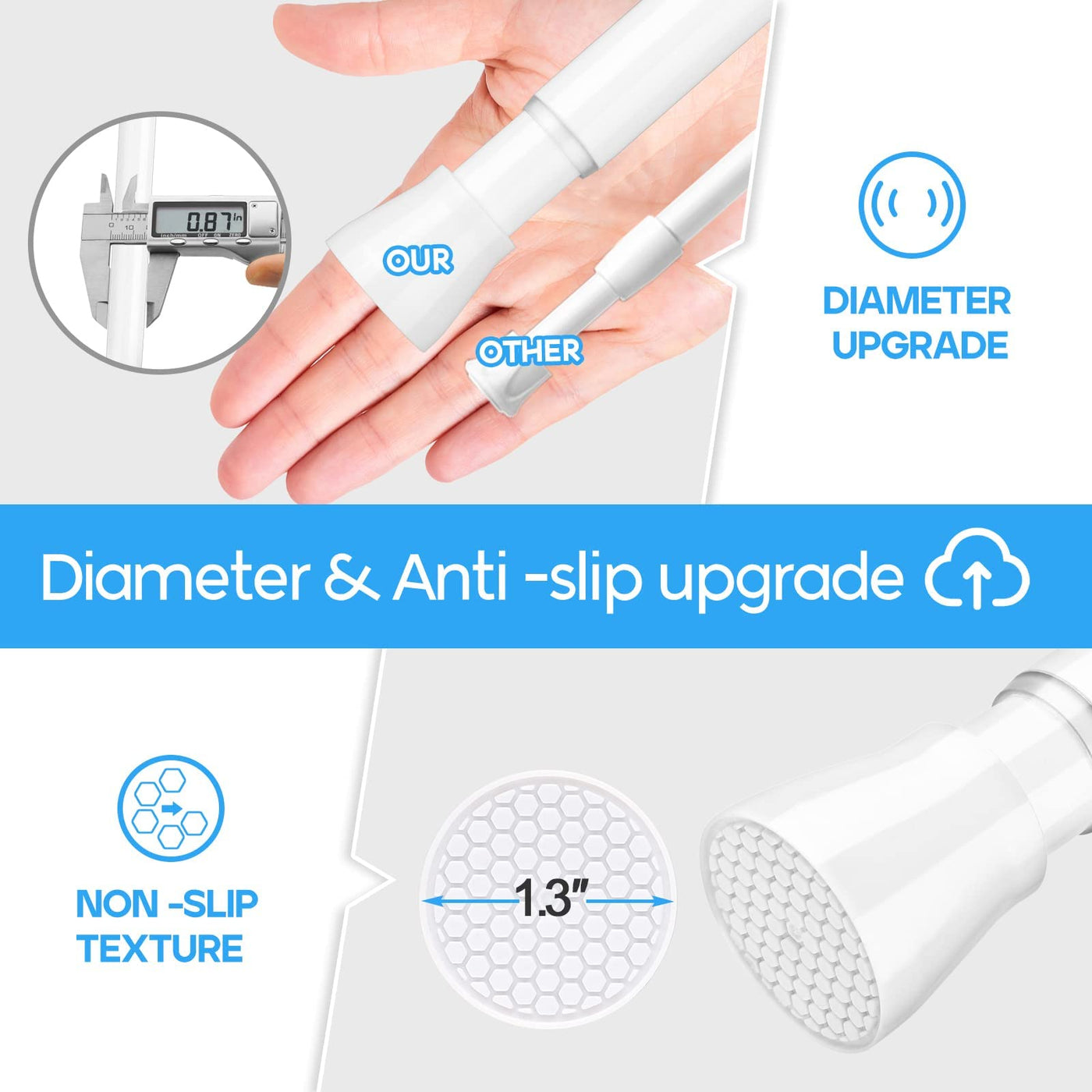This shower curtain rod has a honeycomb plastic pad design, which makes the shower curtain rod more stable and prevents the rod from sliding or shifting. In addition, colors such as black and ceramic white provide you with different choices to better match the decoration needs of different styles of bathrooms. This time, there is no need to buy any extra buckles. The shower curtain rod has its own clamping mechanism, which can directly fix different types of shower curtains on the shower curtain rod, making it more convenient for consumers to use.