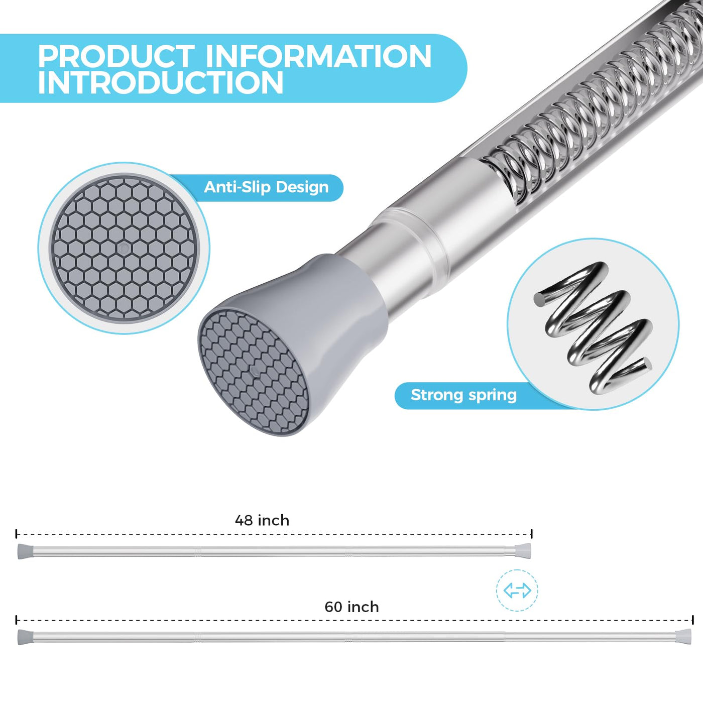 Tension Rods 33 To 59 Inches Shower Tension Rod 2Pcs, Tension Curtain Rods Spring Curtain Rod Silver Tension Rod Spring Loaded Curtain Rods Adjustable Tension Curtain Rod For Window, Doorway