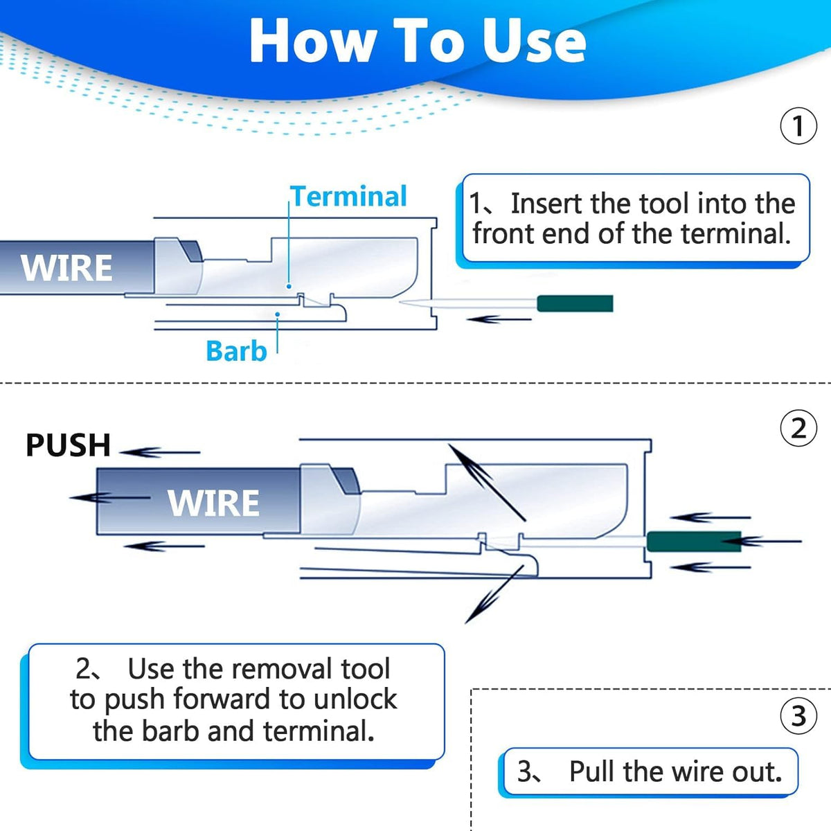 Q: How do I use the terminal pin removal tools without damaging the connectors?A: To use the terminal pin removal tools effectively, carefully push and pull the pins from the wire harness connectors. Be sure to lift or flatten any barb clips holding the wires in place before gently pulling them out.
