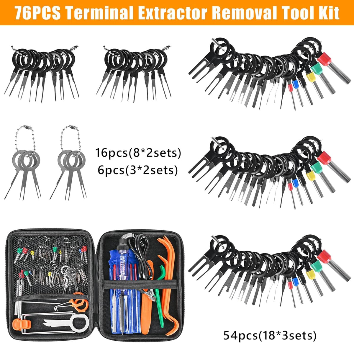 Q: What is included in the Terminal Removal Tool Kit?A: The Terminal Removal Tool Kit includes a total of 96 pieces: 76 terminal removal tools, 1 automotive circuit tester, 5 diamond grip terminal cleaners, 13 automotive trim removal tools, and 1 protective bag.