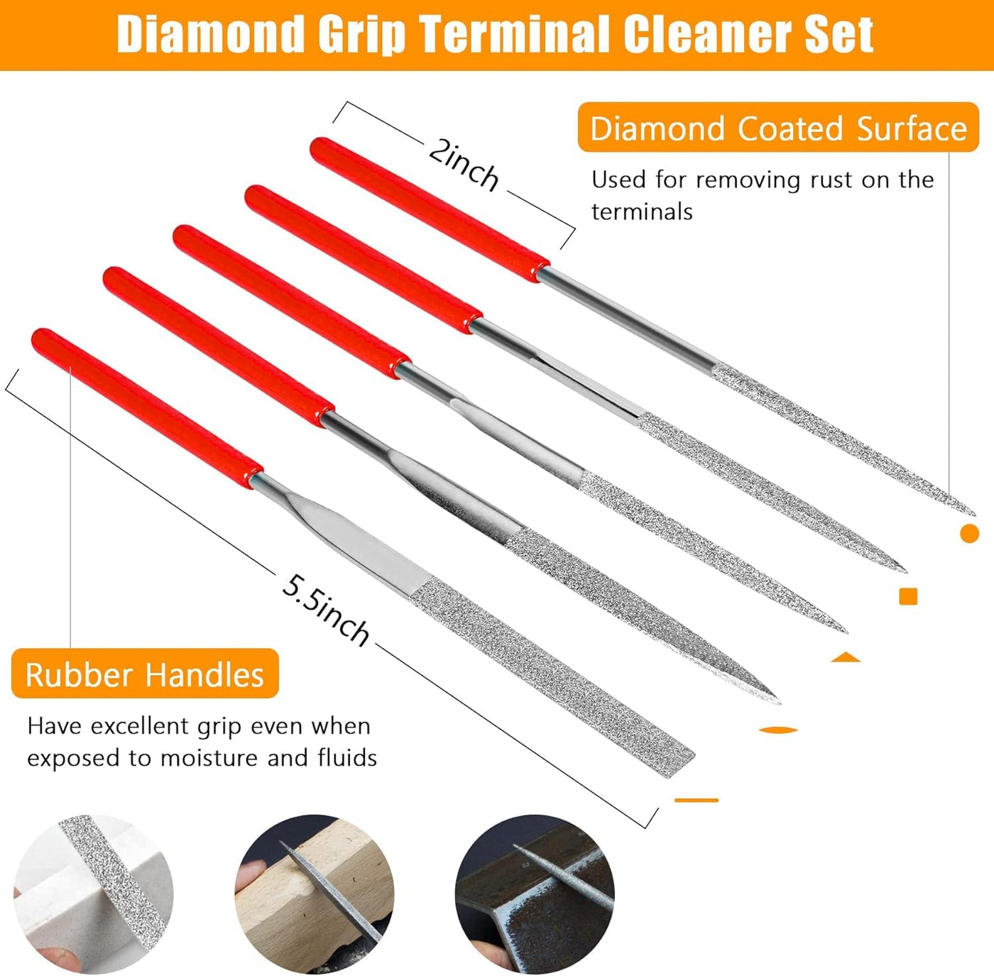 Q: Are the diamond grip terminal cleaners effective for terminal maintenance?A: Yes, the diamond grip terminal cleaners are designed to remove corrosion and extend the life of harnesses, effectively cleaning both flat and casing shape terminals for improved performance.