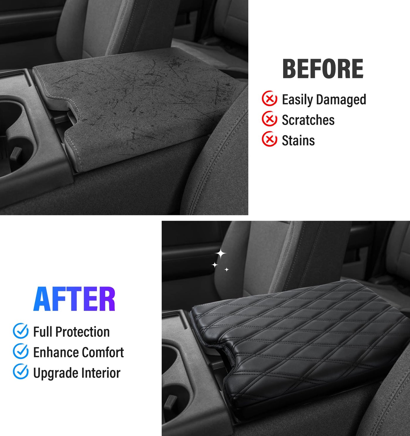 Looking for a center console cover that fits your Ford F150/F250/F350 like a glove? Look no further than this armrest cover - the perfect super duty accessory for people who want to protect their consoles from wear and tear. Fitment: This thickened center console cover is compatible with 2015-2025 F150, 2017-2025 F250 F350 F450 F550 with 40/20/40 jump seat console ( Note: Jump Seat Console Only, NOT for bucket seat console and the console with work surface.) Features: WITH BACK HIDDEN POCKET - The F150 armrest cover with back hidden storage pocket, provides an additional private space for storing cash, cards, capsules, insurance policy, driver's license and anything you need to hide and secure. Turn the vehicle's wasted space into useful storage. Optimize the available space in your armrest box. COMFORTABLE DRIVING EXPERIENCE - Our Ford F150 center console cover with the thickened density sponge, makes your center console softer, simultaneously elevates the height of center console, provides comfortable braces and relax your arms while driving. SCRATCHPROOF & WATERPROOF - This ford f150 accessory is made of scratch-resistant PU leather, protecting your center console from pet claws, fingernails, or key scratching. Also, this middle console cover is waterproof and dirt-proof, easy to clean with a towel or tissue. LUXURY APPEARANCE - The unique diamond pattern and exquisite stitching technique, make your car armrest box lid look luxurious. Get your car a new look with this luxurious middle console cover! And you no longer have to worry about scratches and damages on your center console lid. IMPORTANT REMINDER - Sinvanho split bench seat console cover comes with 1 year product service. If you have any concern or question, do not hesitate to contact us. Before purchasing, please carefully check whether this f150 jump seat cover is suitable for the center console of your car. Package Included: 1 x Center Console Cover with Hidden Pocket
