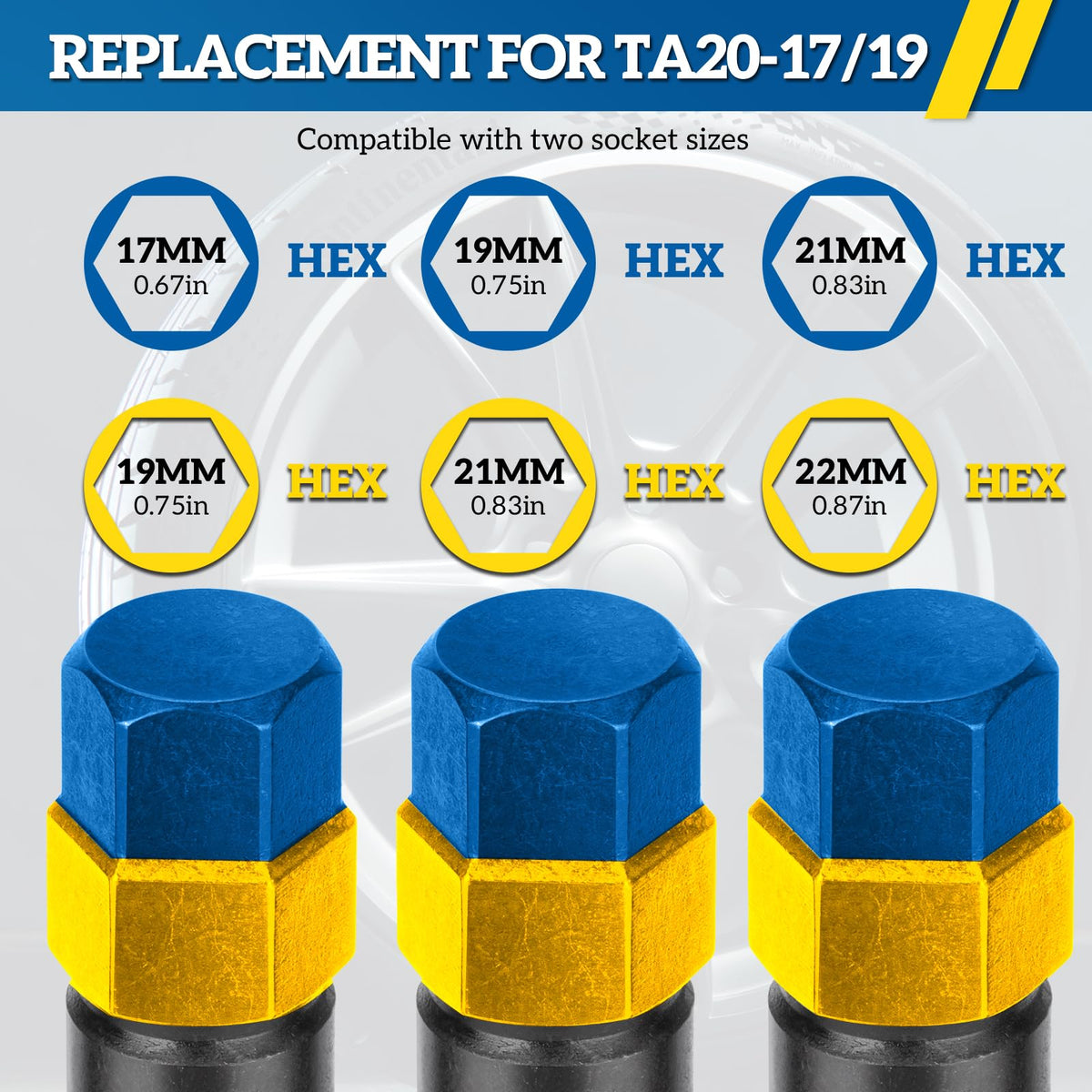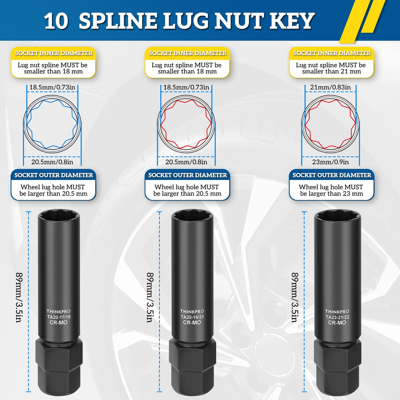 Discover the ultimate solution for your wheel maintenance needs with our versatile 10 Spline Lug Nut Key Replacement Set, designed to fit both TA20-17/19,TA20-19/21 and TA20-21/22 models. Crafted from high-quality cold-forged CR-MO steel and finished with a heat-treated, black oxidized coating, our wheel lock kit promises unmatched durability and corrosion resistance. Experience the convenience of dual hex head drivers that swiftly interchange with different mm sockets, ensuring efficient removal of Bimecc 10-Spline lug nuts and bolts. With laser-etched size markings for effortless identification and a portable plastic case, our professional-grade tool set is the go-to for mechanics and DIY enthusiasts alike. Whether you're tackling brake operations or performing tire changes, our 10 spline lug nut kit empowers you to maintain your wheels with ease, anytime, anywhere. Don't let incompatible wheel nuts hold you back-upgrade to our reliable and efficient lug nut key set today and take control of your vehicle's wheel maintenance.
