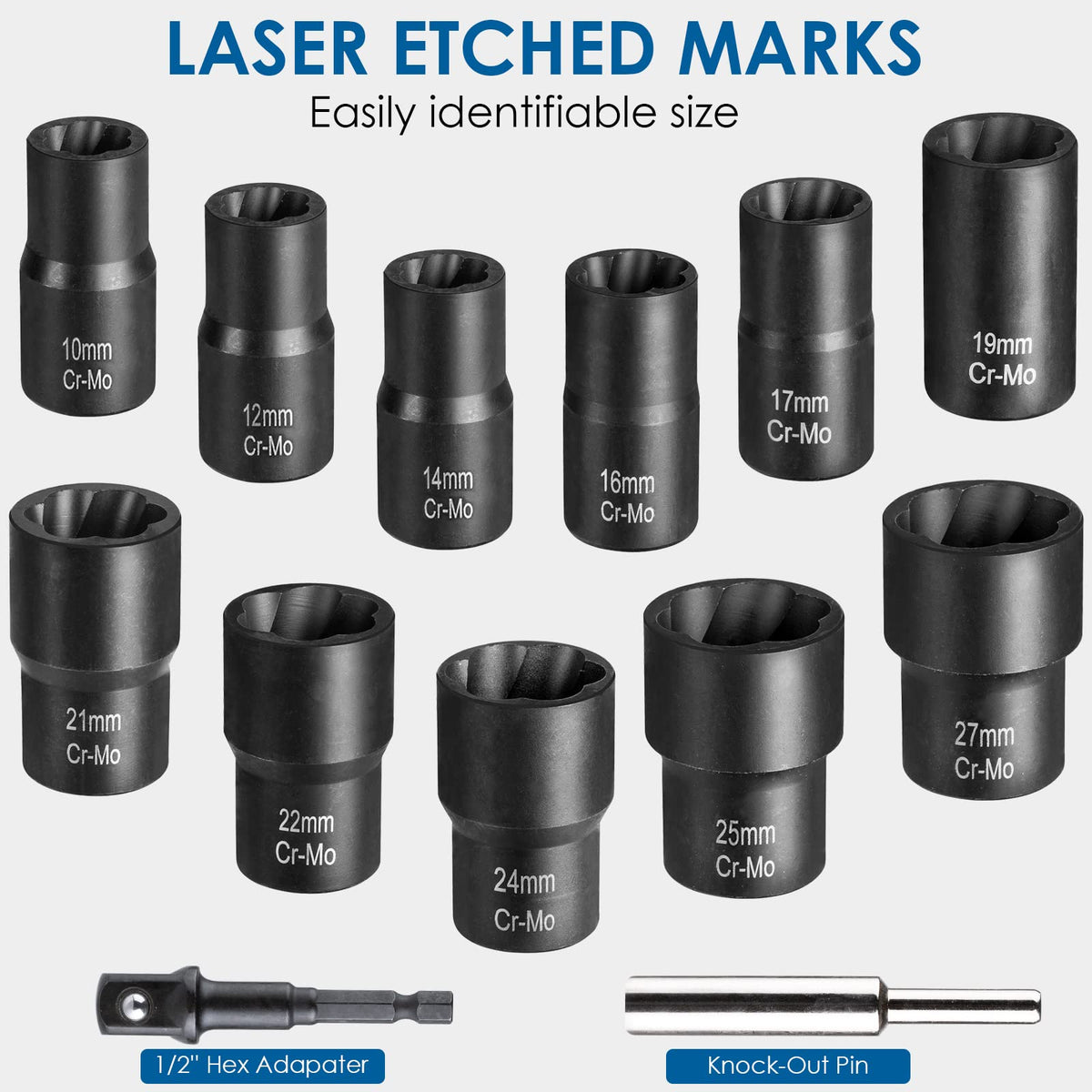 Q: What sizes are included in the THINKPRO Lug Nut Removal Tool set?A: The THINKPRO Lug Nut Removal Tool set includes 13 different sizes of sockets: 10mm, 12mm, 14mm, 16mm, 17mm, 19mm, 21mm, 22mm, 24mm, 25mm, and 27mm, providing versatility for various lug nut sizes.