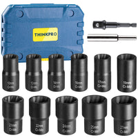 The THINKPRO 13 PCS Bolt Nut Extractor Set is a powerful tool that can help you remove any damaged, frozen, rusted or rounded-off bolts and nuts from your vehicle or machinery. The set includes 13 different sizes of sockets that fit most common lug nuts and fasteners. The sockets are made of chrome molybdenum steel with a black phosphate coating for strength and durability. The sockets have a spiral fluted design that bites into the bolt or nut and provides a tight grip. The sockets have a 1/2-inch drive that can be used with any standard impact wrench, breaker bar or ratchet. The sockets have a hexagonal shape that allows you to use them with a wrench or pliers if needed. The THINKPRO 13 PCS lug nut removal tool is an indispensable tool for any automotive enthusiast, mechanic, farmer or engineer who needs to remove stubborn or seized bolts and nuts. The set comes in a sturdy metal case for easy storage and transport. Order yours today and get the job done faster and easier!