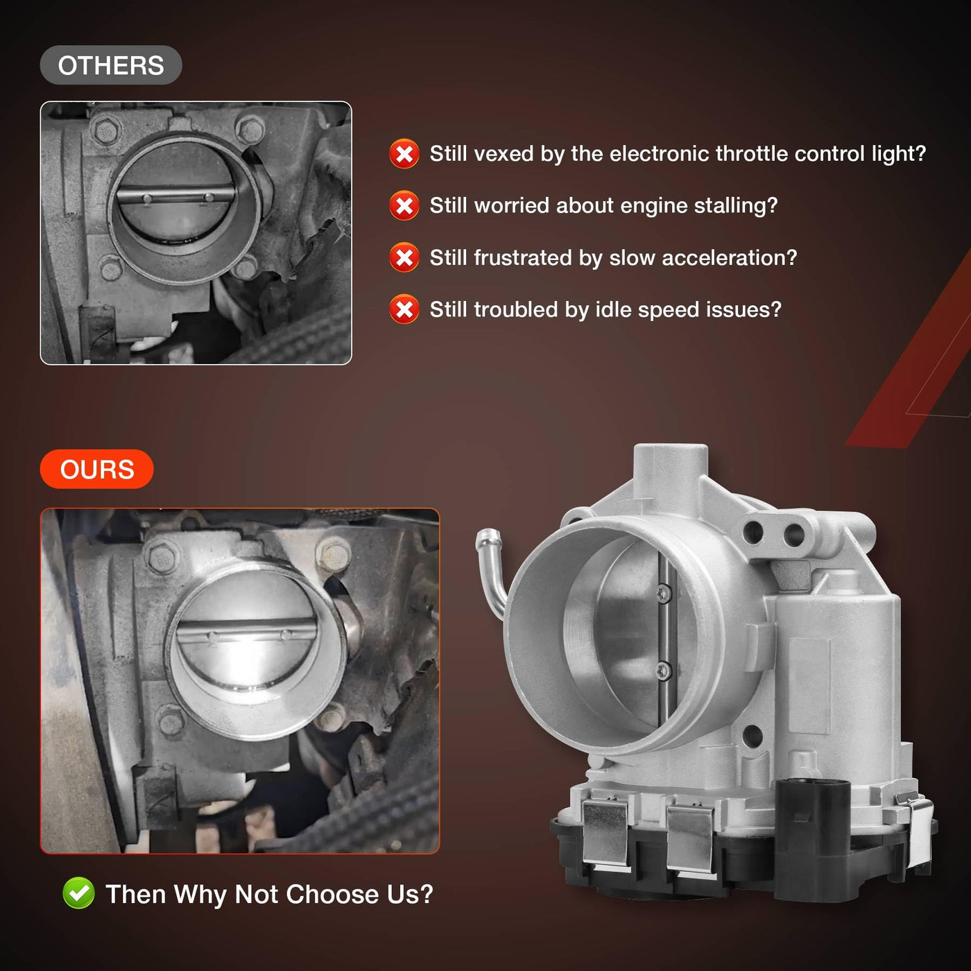 Q: What are the key features of this Throttle Body Assembly?A: Key features of this Throttle Body Assembly include OEM design for direct fit, premium quality materials for durability and heat resistance, and a redesigned electronic board with a new hall effect sensor for longer service life.