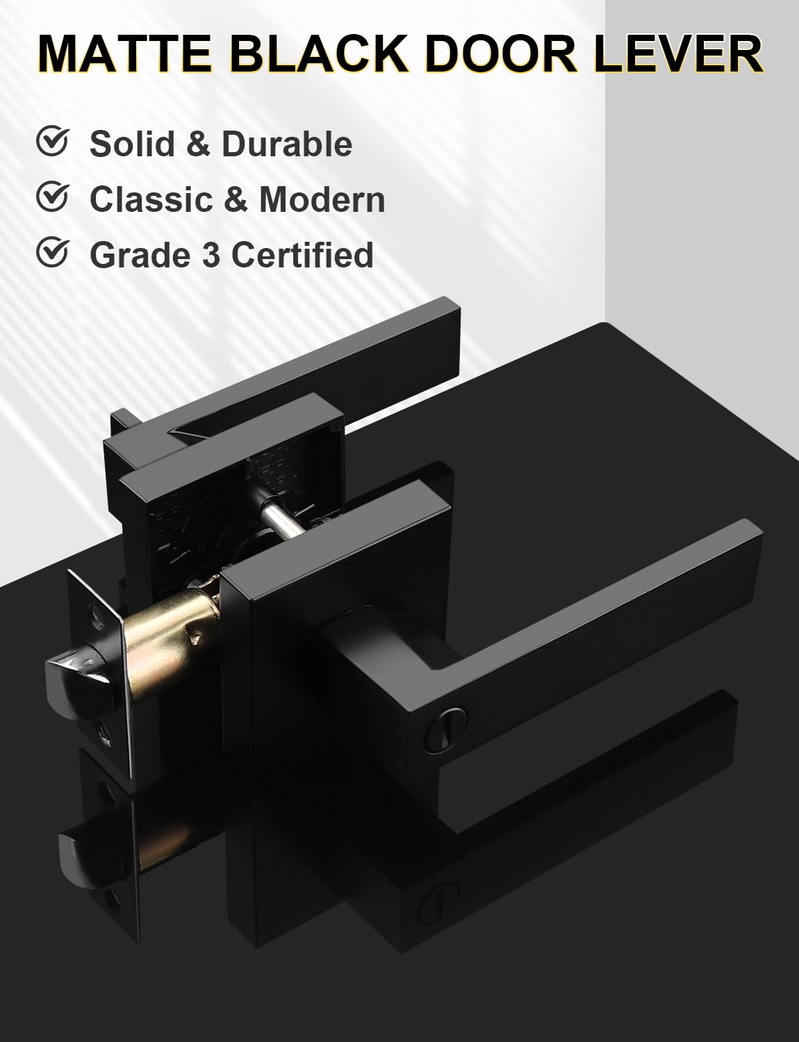 v Finish: Satin Nickel/Black/Gold vStyle: Contemporary & Low Profile design vNote: The square plate on the latch is not removable vCertification: ANSI Grade 3, exceeds 200,000 cycles v Easy Installation: Installs with just a Phillips screwdriver vShape & Size: Square Rose/Baffle with a rectangular handle vMaterial: Solid Steel (Latch), Stainless Steel (Handle), Zinc Alloy accessories vPackage Includes: Door lever, latch, cylinder, mounting screws, strike plate, and installation instructions vDimension: Adjustable Latch with a backset of 60mm (2-3/8') or 70mm (2-3/4'); fits all doors 35 to 45 mm (1-3/8' to 1-3/4') thick vLever Advantage: The lever design requires only a downward press, making it easier to use than a knob, especially for children, seniors, or anyone with arthritis.
