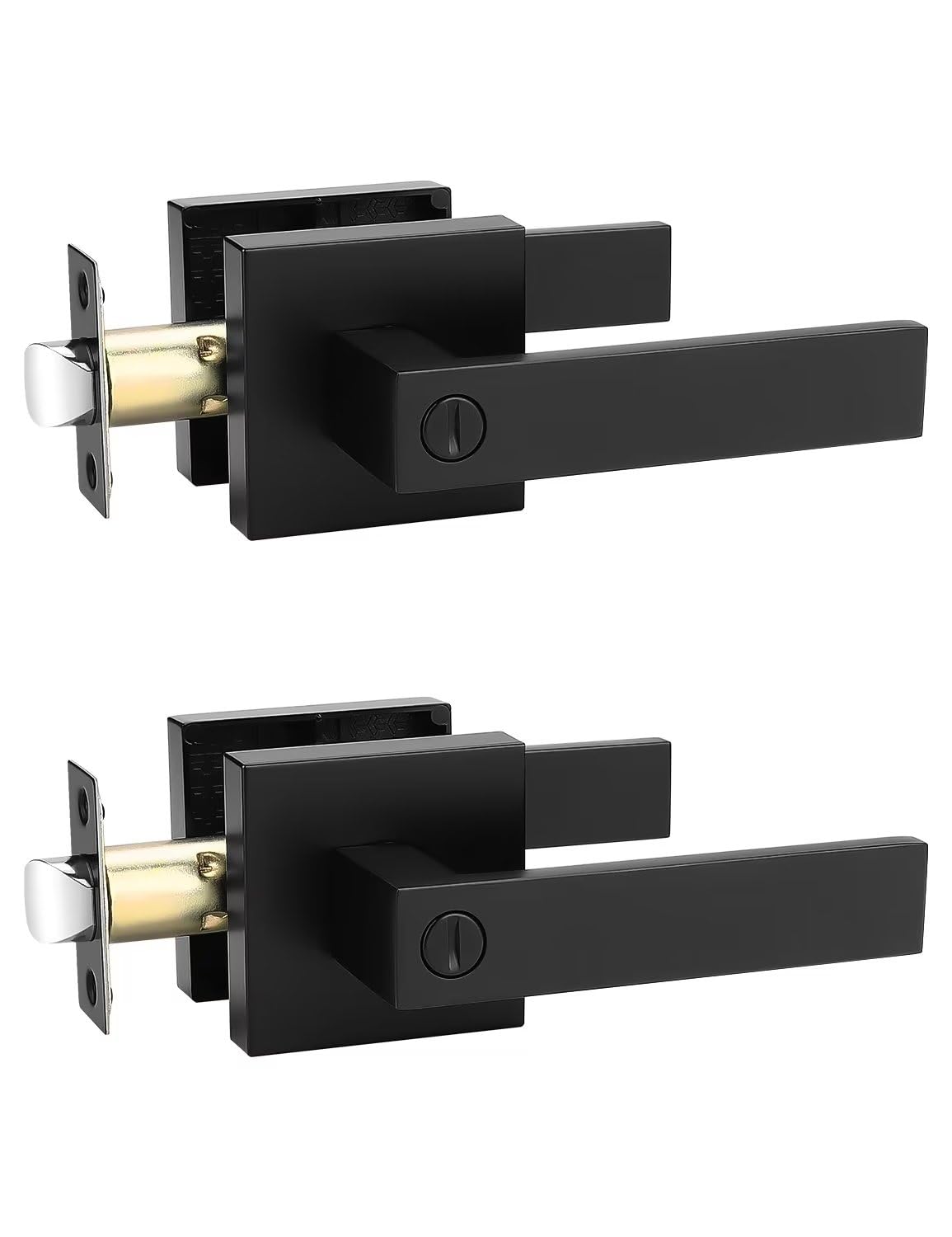 Tinewa 2 Pack Square Privacy Door Levers Locksets In Matte Black Finish, Bed/Bath Door Levers Keyless Interior Handles,Reversible For Left Right Handed Doors