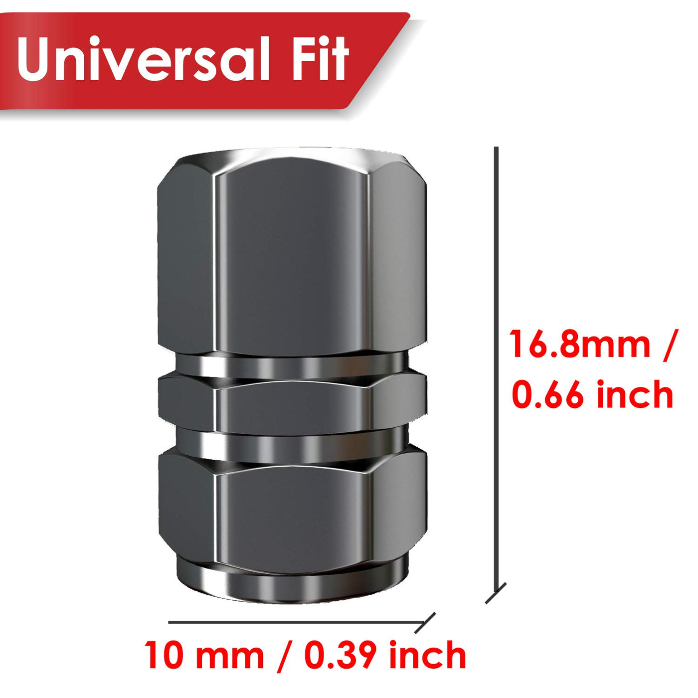 Aluminum Alloy chrome stem tire valve caps with RUBBER RING (Flat Top) : Metal stem tire valve caps can protect your valves from dirt and corrosion, help you to replace original bad valve cap of tyre. Good quality material: The valve cap is made of durable aluminum alloy and rubber which can extend service life of tire. Universal size fits for most cars, bus, trucks, motorcycle, bikes and other vehicles. Easy to hold and install: With hexagon shape design, convenient to install. Conveniently install or remove when you want to check air pressure. Specifications: Quantity: 12 pack Material: aluminum alloy + O rubber seal Color: chrome/silver Size: 16.8 x 10 mm/ 0.66 x 0.39 inch Package includes: 12 x Tire valve dust caps Warning: Although these premium aluminum tire caps are anodized and resistant to corrosion, they can fuse to the tire valve stem if not cared for properly. Prior to installation and between reapplication, apply grease to help prevent fusion.