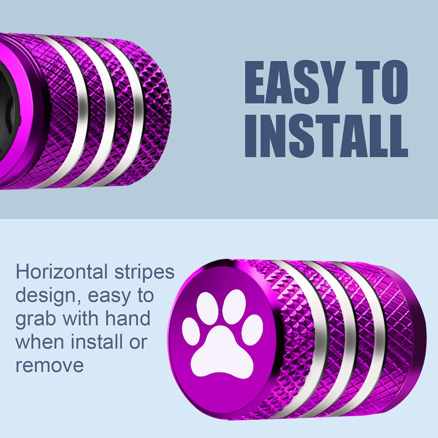 Q: How do I install the tire valve caps?A: The tire valve caps can be easily installed by hand. Their simple design with smooth horizontal stripes allows for straightforward tightening or removal without any special tools.