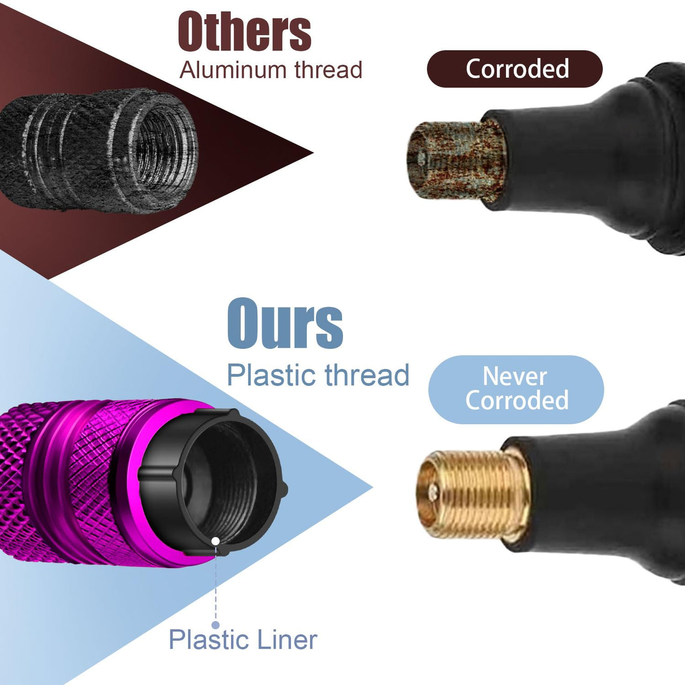 Q: Are these tire valve caps resistant to corrosion?A: Yes, the anti-corrosion design includes a plastic liner that helps protect the caps from corrosion and chemical damage, prolonging the lifespan of your tires and valve stems.