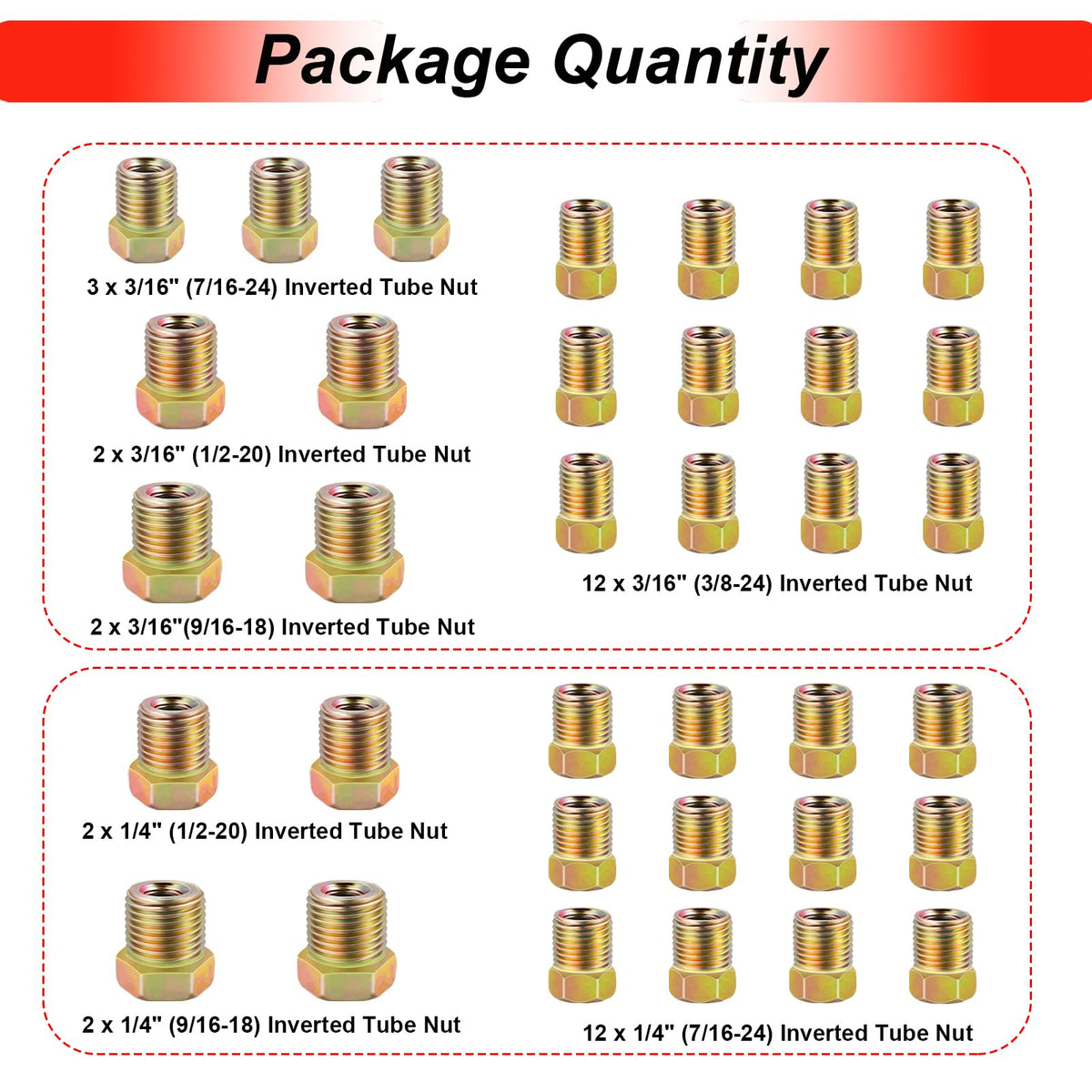 Application: This Brake Line Nut Is Suitable For Inverted Bellmouth On 3/16 Inch And 1/4 Inch Tube.Note:The Nut Threads Are Regular Tube Fitting Size. Please Check Before Shopping!