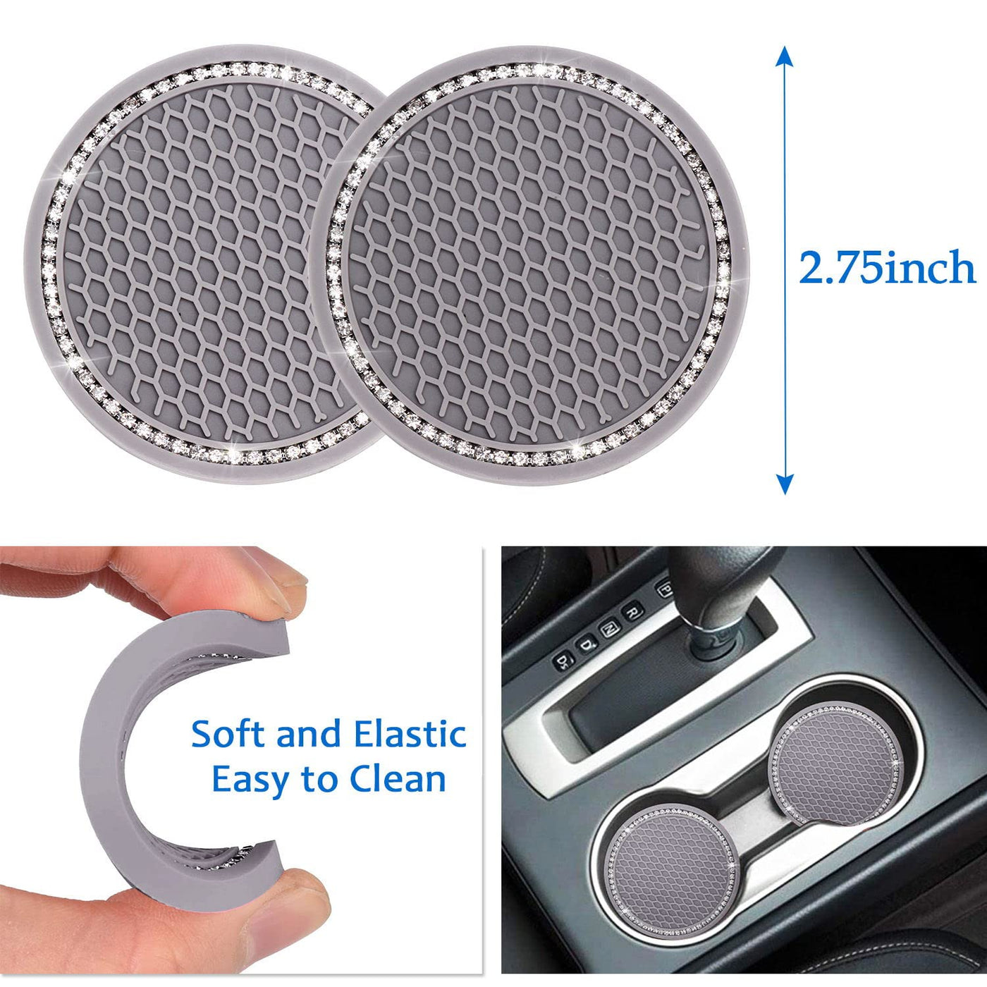 Package included: 2* Gray Car Coasters 4* Gray headrest collar rings 1* Grey Car Charger Adapter 2* Grey Car Hooks 2* Grey bling start button ring 4* Gray bling Tire Valve Stem Caps
