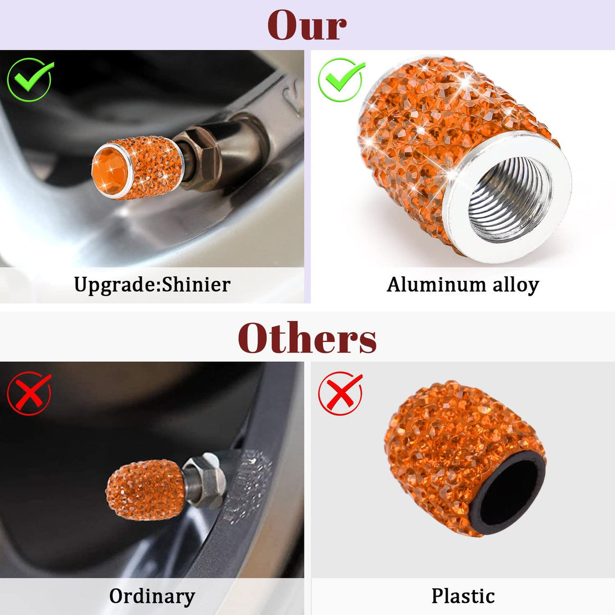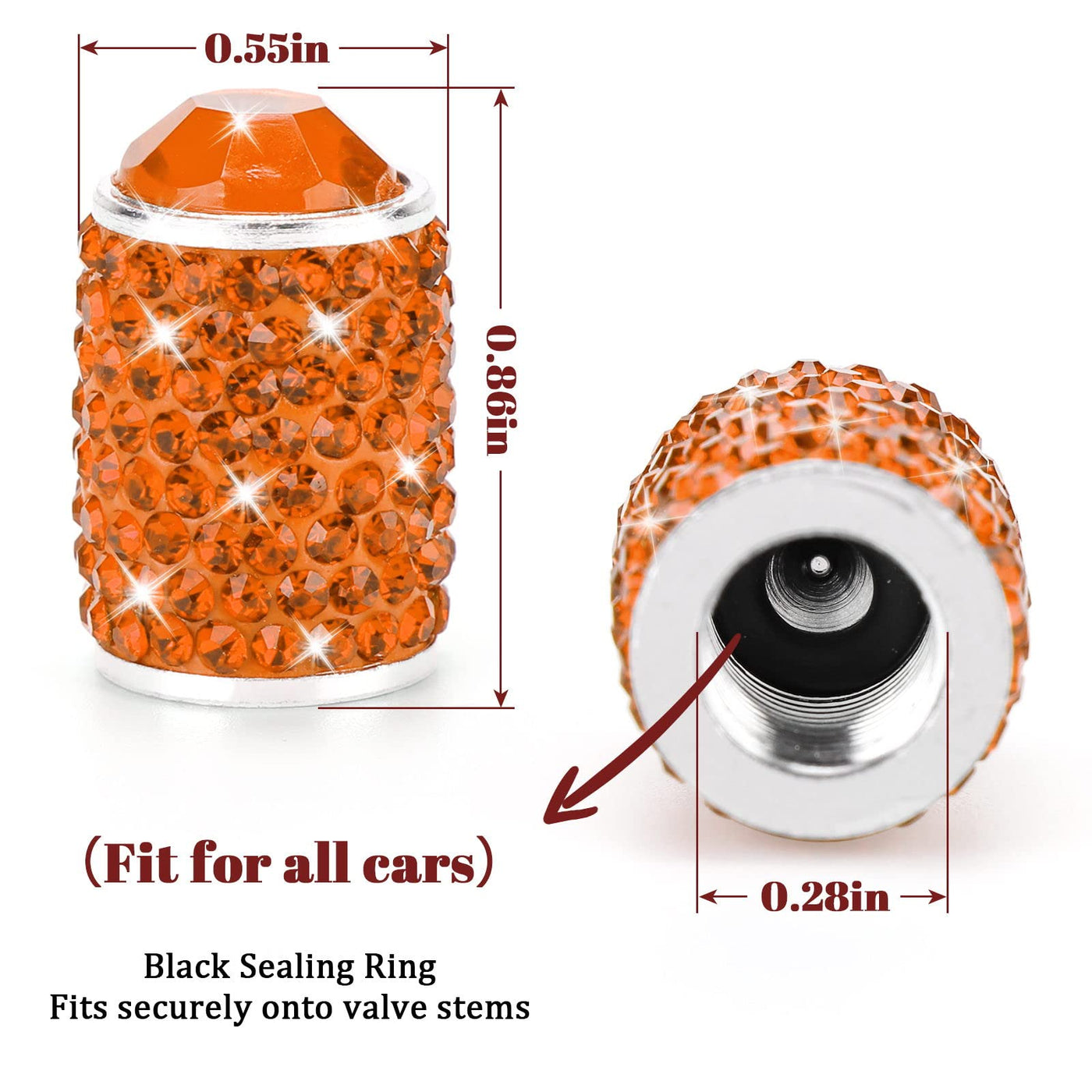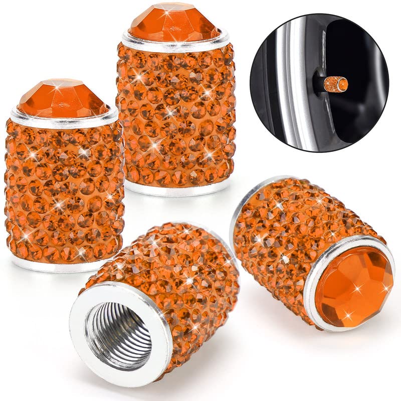 You'll never find an aluminum bling bling orange valve stem covers so shiny and durable like this item!!!Feature:Anti-Leakage: The inside rotating thread structure tire valve stem caps can fastened tightly with tire stem.Anti-Rust: These bling orange tire caps 4 pack can effectively prevent the valve from being covered with dust/snow/rainwater. extend the life of the tire.Strong and Sturdy: The bling orange tire valve caps don't fade or break up during car washesThe diamond valve stem covers add the perfect touch of bling to tires, you will get MANY COMPLIMENTS!Specifications:Color: WhiteMaterial: Aluminum alloy + RhinestoneDrilling Process: HandmadeSize: 0.86''x 0.55''(H*W)Universal Fits: all standard American (Schrader) valvesPackage4 * crystal orange tire valve caps*** If you have any question please let me know,we are provide best service for you ***