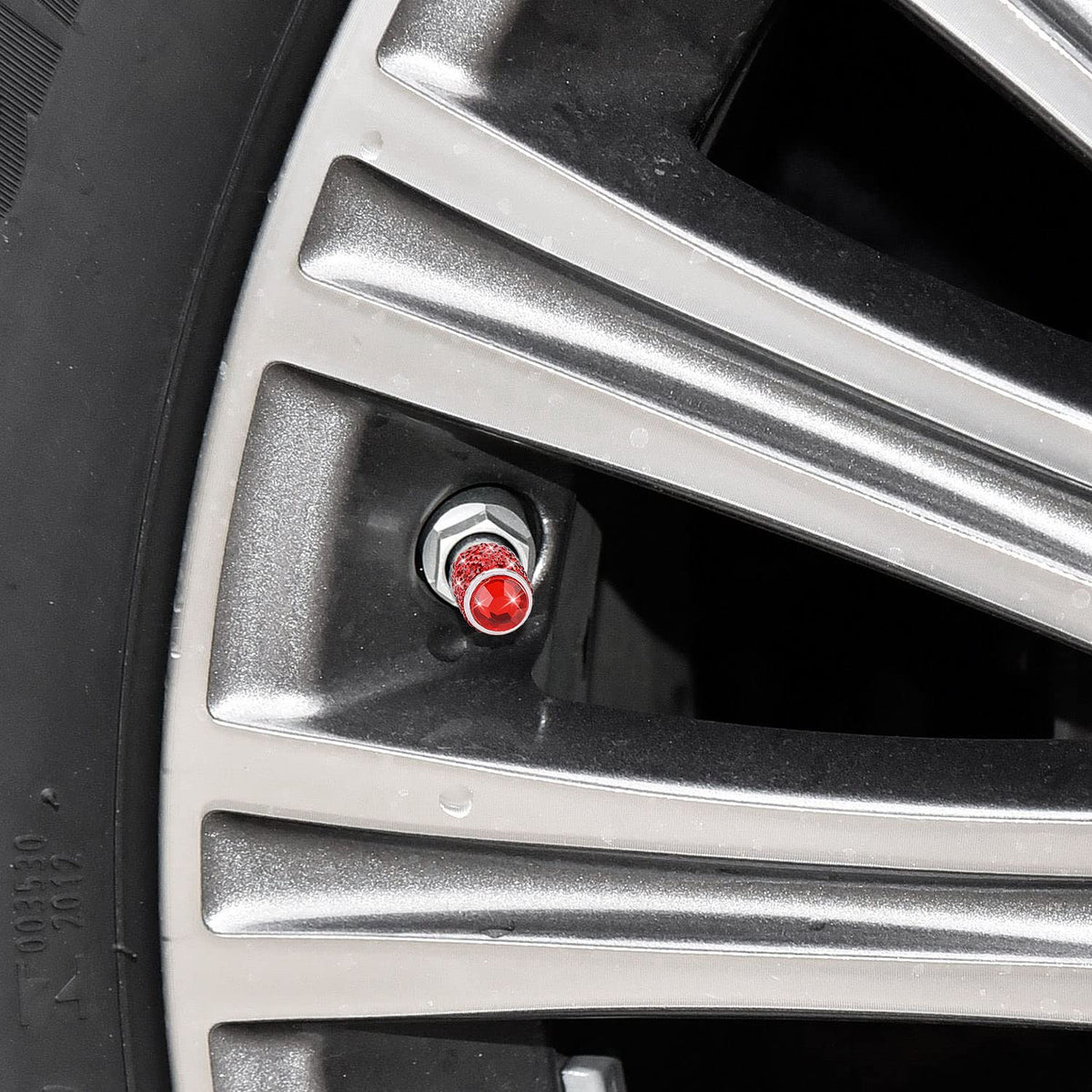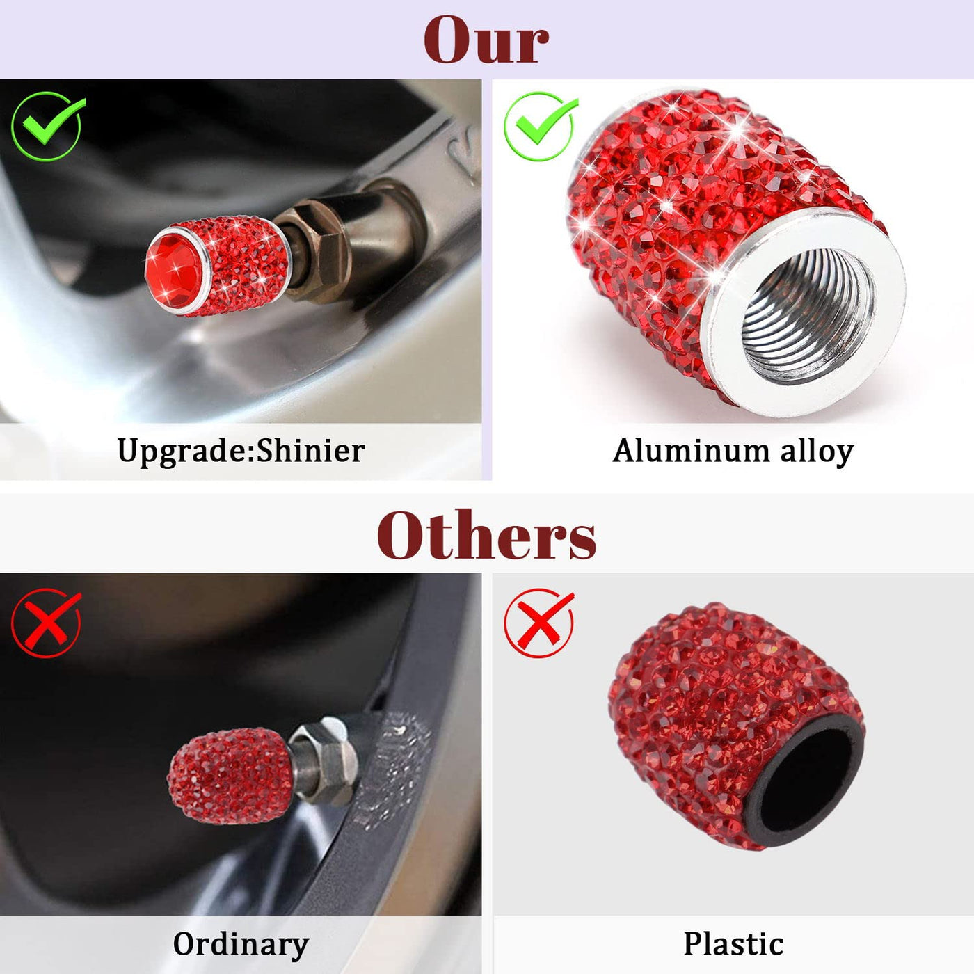 Feature: Anti-Leakage: The inside rotating thread structure tire valve stem caps can fastened tightly with tire stem. Anti-Rust: These red tire caps 4 pack can effectively prevent the valve from being covered with dust/snow/rainwater. extend the life of the tire. Strong and Sturdy: The red tire caps bling don't fade or break up during car washes The red tire air caps add the perfect touch of bling to tires, you will get MANY COMPLIMENTS!