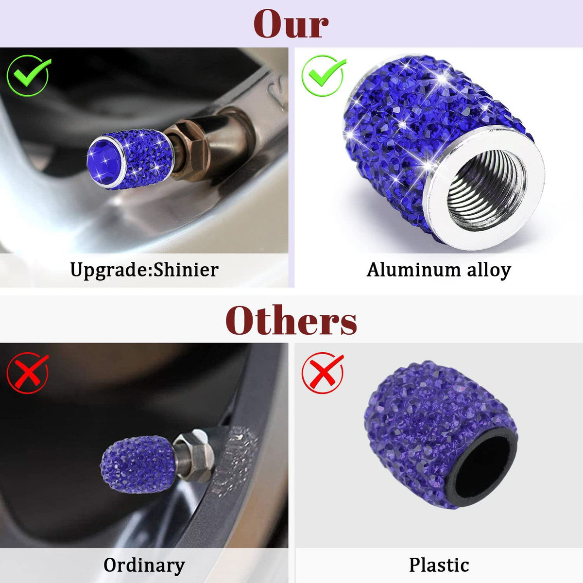 You'll never find an aluminum blue bling tire valve caps so shiny and durable like this item!!! Feature: Anti-Leakage: The inside rotating thread structure tire valve stem caps can fastened tightly with tire stem. Anti-Rust: These blue tire caps 4 pack can effectively prevent the valve from being covered with dust/snow/rainwater. extend the life of the tire. Strong and Sturdy: The blue diamond tire caps don't fade or break up during car washes The blue car tire valve caps add the perfect touch of bling to tires, you will get MANY COMPLIMENTS! Specifications: Color: White Material: Aluminum alloy + Rhinestone Drilling Process: Handmade Size: 0.86''x 0.55''(H*W) Universal Fits: all standard American (Schrader) valves Package 4 * Blue tire valve stem cover *** If you have any question please let me know,we are provide best service for you ***