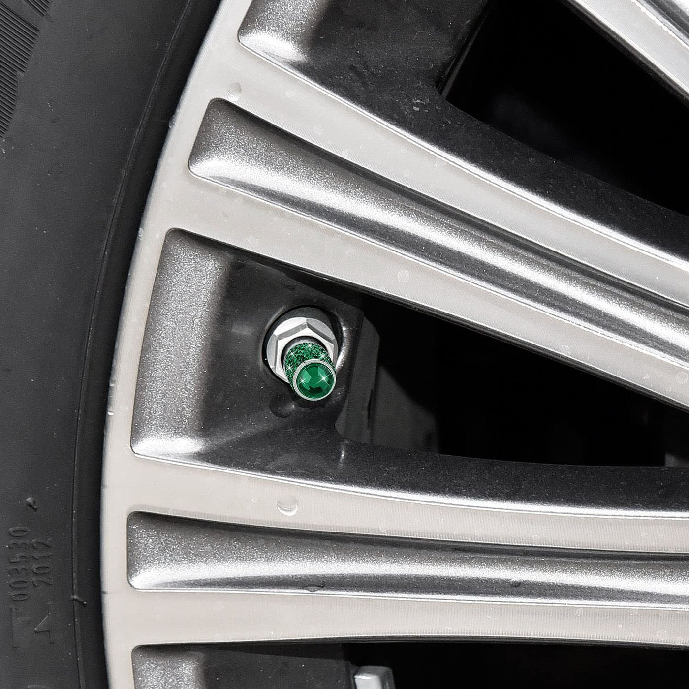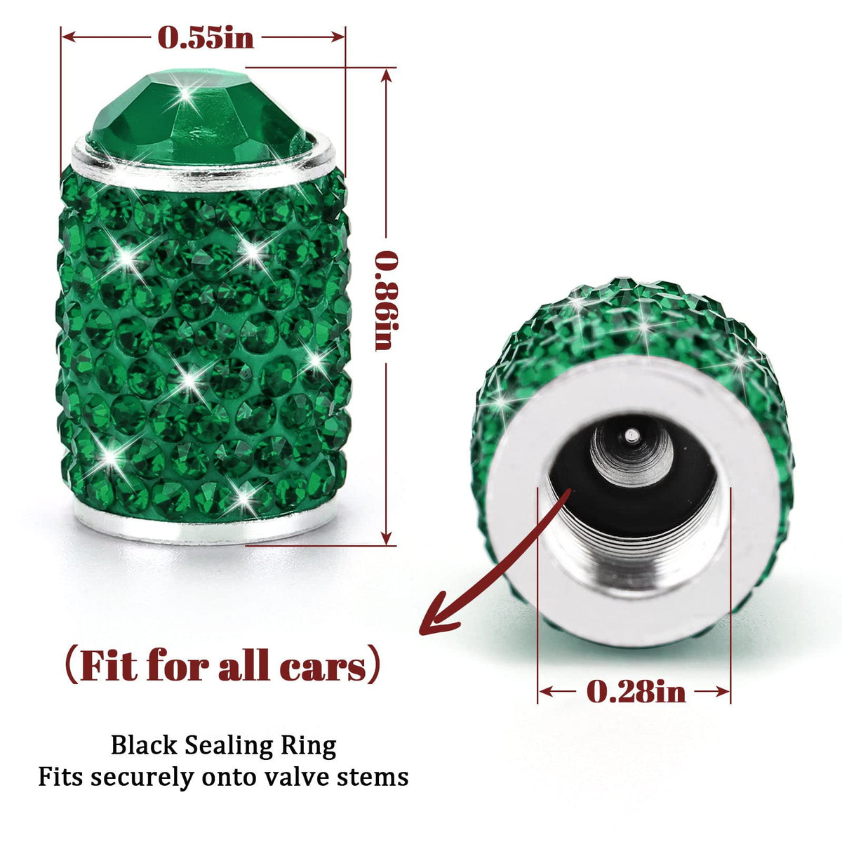 You'll never find an aluminum bling bling green air tire valve stem cover so shiny and durable like this item!!!Feature:Anti-Leakage: The inside rotating thread structure tire valve stem caps can fastened tightly with tire stem.Anti-Rust: These bling tire caps 4 pack green can effectively prevent the valve from being covered with dust/snow/rainwater. extend the life of the tire.Strong and Sturdy: The pink tire nozzle caps don't fade or break up during car washesThe bling green valve stem covers add the perfect touch of bling to tires, you will get MANY COMPLIMENTS!Specifications:Color: WhiteMaterial: Aluminum alloy + RhinestoneDrilling Process: HandmadeSize: 0.86''x 0.55''(H*W)Universal Fits: all standard American (Schrader) valvesPackage4 * bling green tire valve caps*** If you have any question please let me know,we are provide best service for you ***