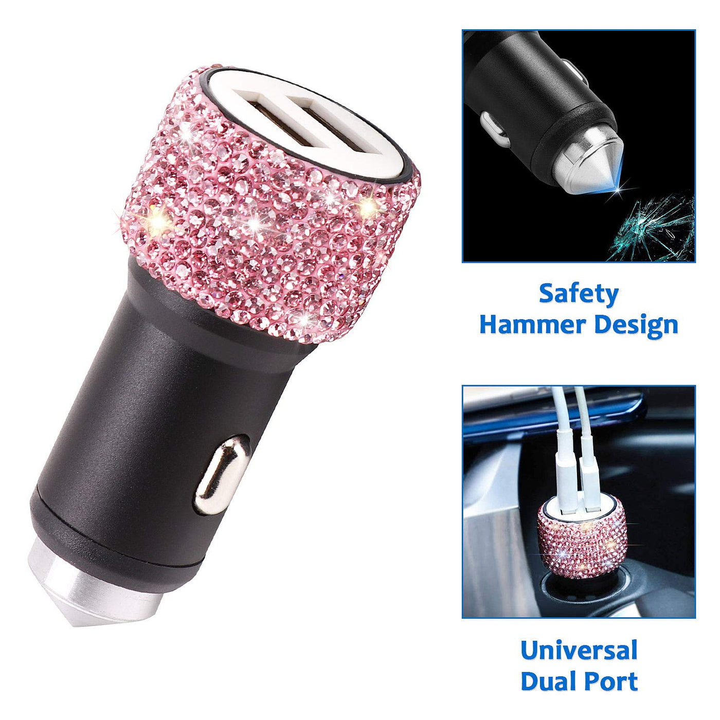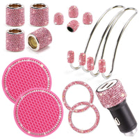 Package included: 2* Pink Bling Car Cup Holder Insert 4* Pink Bling Car Headrest Collars Rings 1* Pink Bling Car Dual USB Charger 2* Pink Bling Car Hooks 2* Pink Bling Start Stop Button Rings 4* Pink Bling Tire Valve Stem Caps