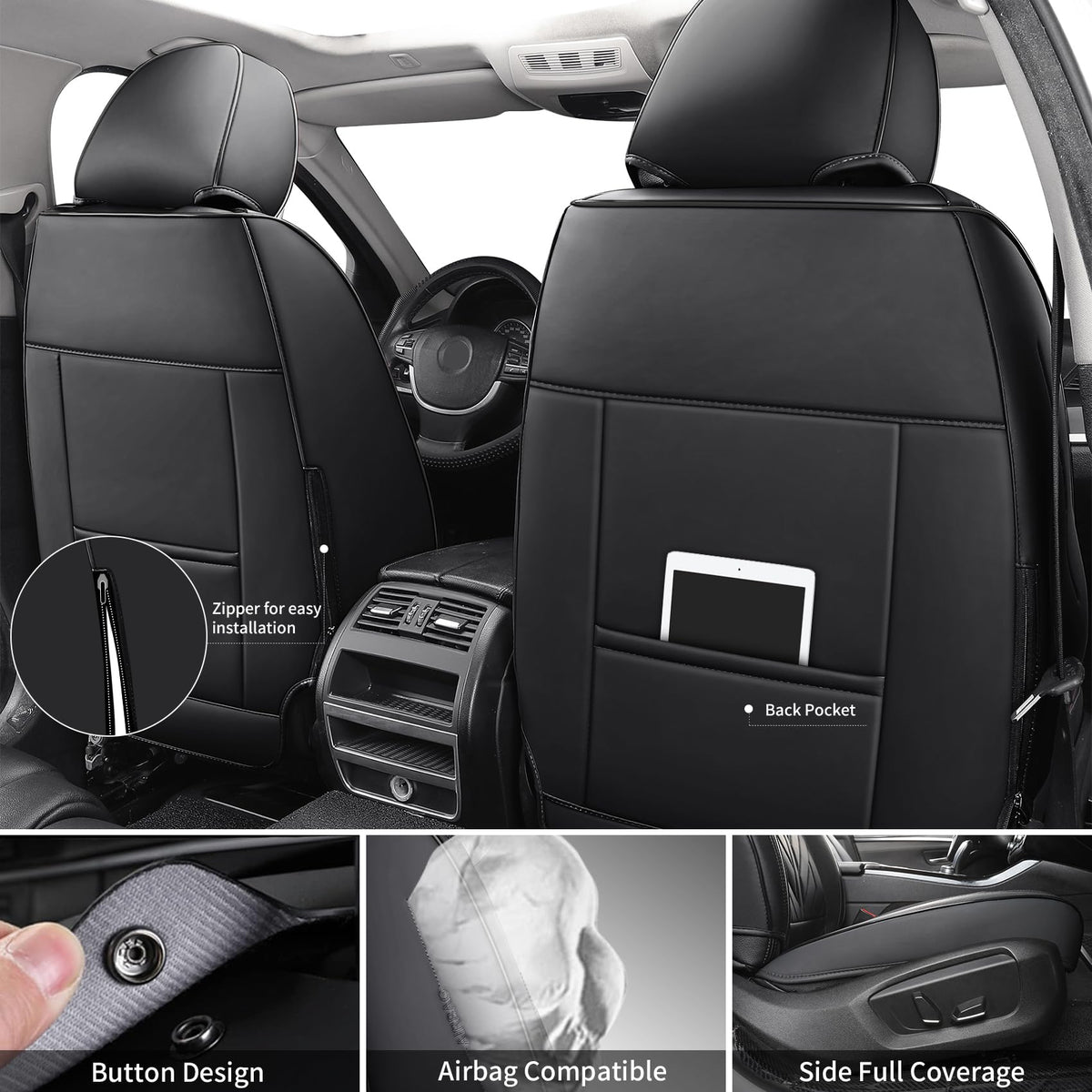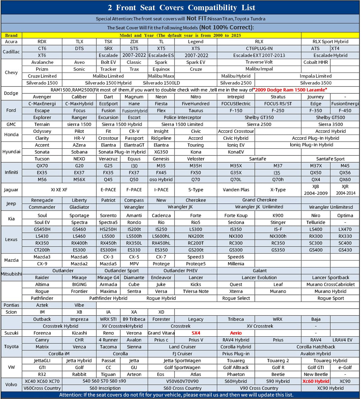 Tomatoman Car Seat Covers for most Car Sedan Truck Van Pickup SUVBrand:TomatomanColors:Black,Black-Red,Black-Gray,Black-BlueFits:Universal FitsFeatures:Snug fits,like a golve,durable,stylish,creative,side zipper for easy to install,easy to clean and install,full coverageUniversal Fit and Full Protection:Fits for most vehicles,such as cars,sedans,hatchbacks,suv,pickup trucks,crew cab,vans,ev,and so onPerfect fits and stylish look:Side zipper for easy install.They will fit snug to your seat,comfortable,wear-resisting,durable,waterproof,non-slip bottom cloth is helpful to stay in placeCompatible airbags-The airbag has enough space to stretch and will never be blocked.The seat belt slot also has been reserved. Armrest compatible and not affect child safety seat.There is a pocket for easily store things like cellphone,laptop and magzines,which help to keep your goods organizedWhat you Expected-car seat cover will go stylish with your interior,which will bring lots of compliments to you,best gift for your husband,family,or friendsPlease read that manual or watch the installation video before you start to install the seat covers