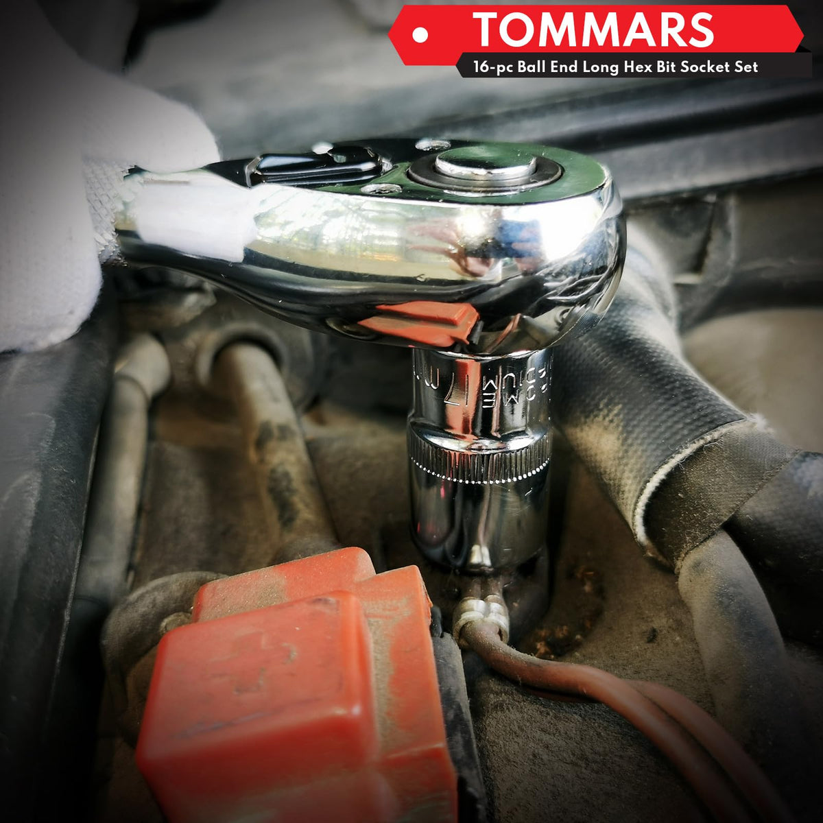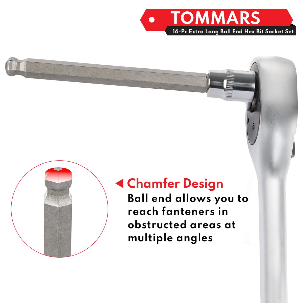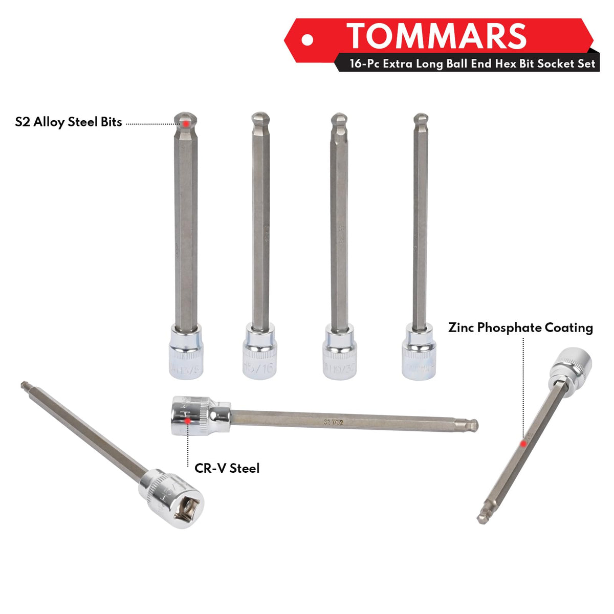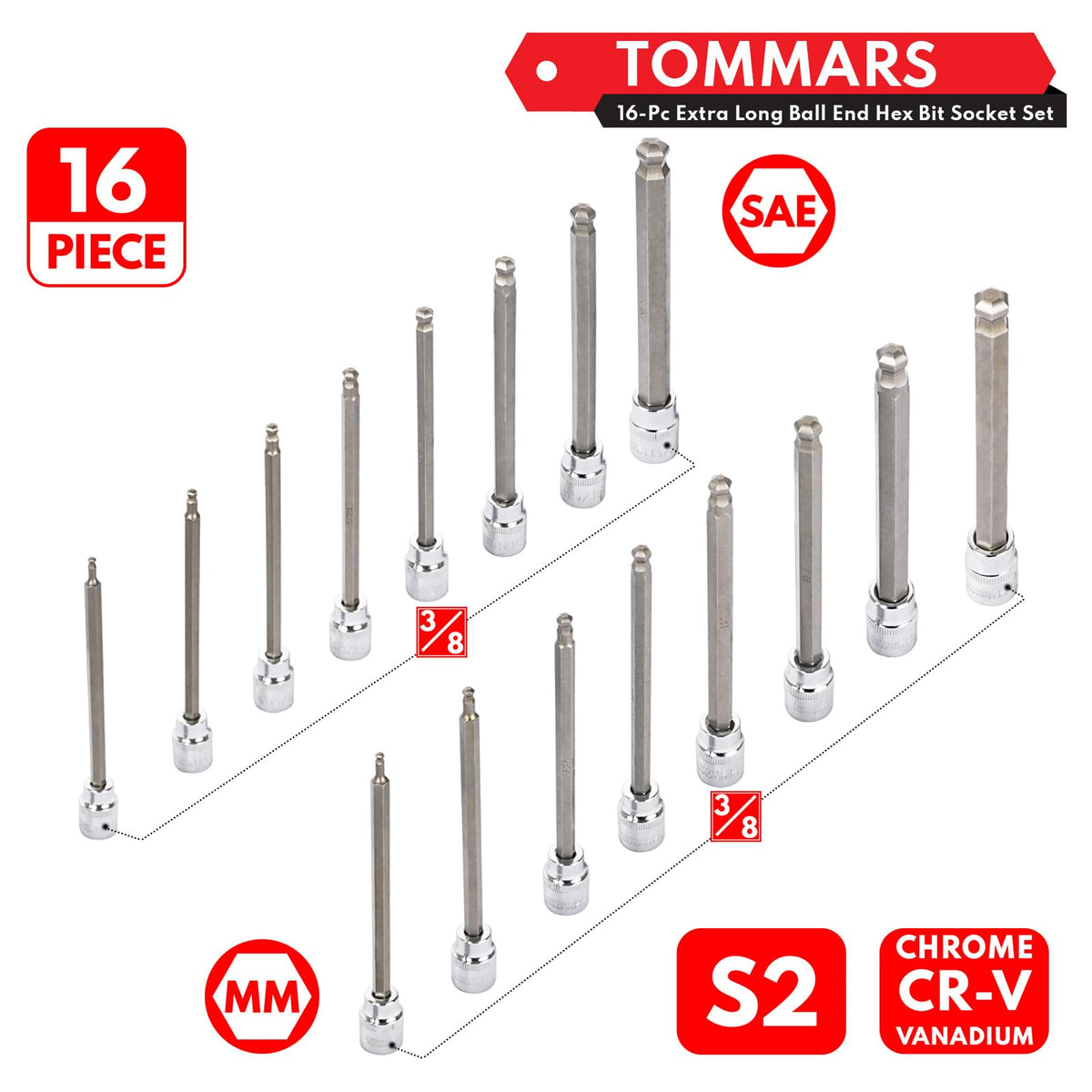 Tommars 16-Pc 3/8 Inch Drive Ball End Long Hex Bit Socket Set, Extra Long Allen Socket Set, Cr-V And S2 Steel, Sae & Metric 1/8-3/8 In., 3-10 Mm.