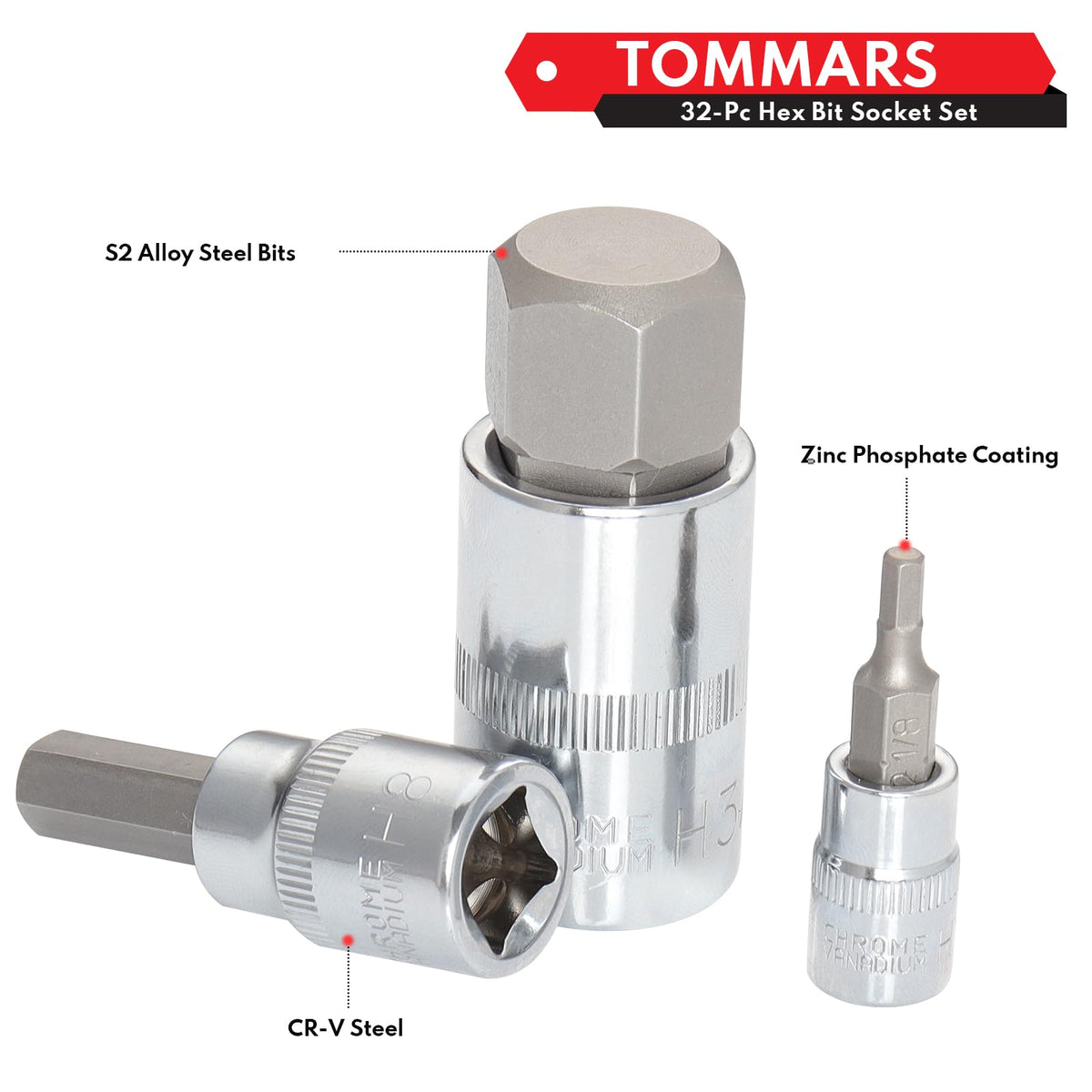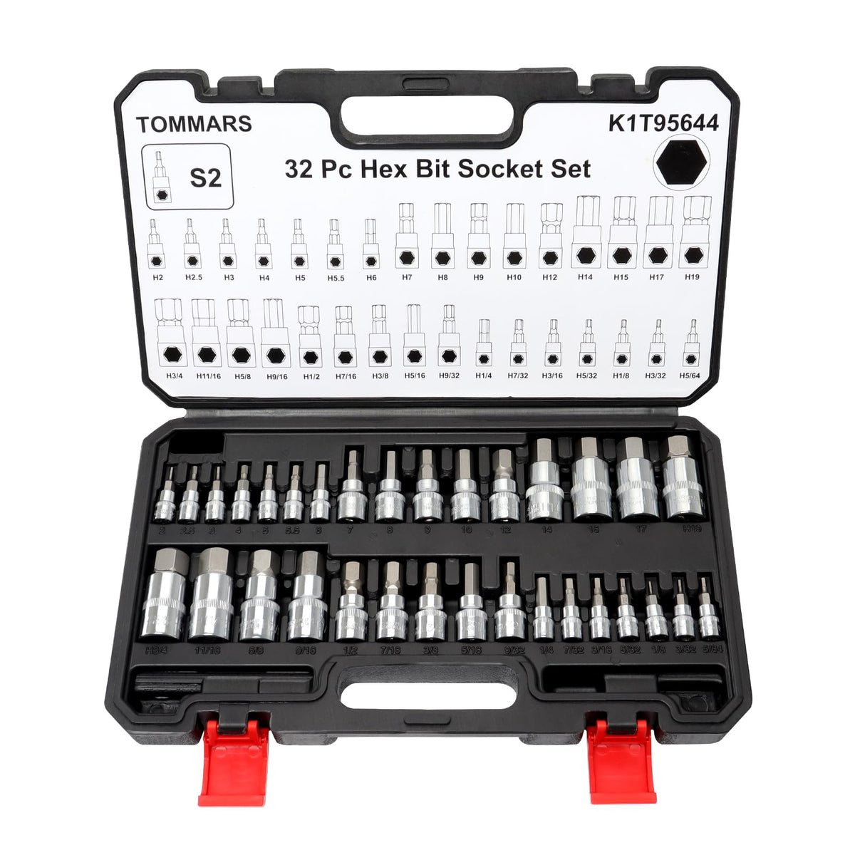 Tommars 32-Pc Master Allen Hex Bit Socket Set, Sae & Metric Allen Hex Key Wrench Socket Set S2 Steel 1/4', 3/8', 1/2' Drive, H5/64 - H3/4 & H2 - H19