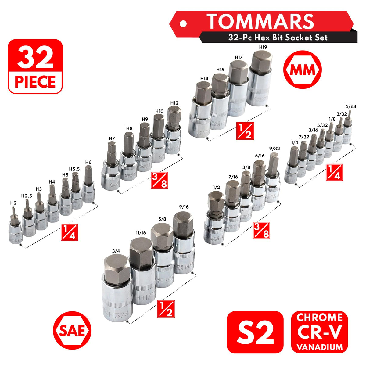 Q: What sizes are included in the TOMMARS 32-PC Master Allen Hex Bit Socket Set?A: The TOMMARS 32-PC Master Allen Hex Bit Socket Set includes a range of metric sizes such as 1/4" drive H2 to H6, 3/8" drive H7 to H12, and 1/2" drive H14 to H19. For SAE sizes, it features 1/4" drive H5/64 to H1/4, 3/8" drive H9/32 to H1/2, and 1/2" drive H9/16 to H3/4.