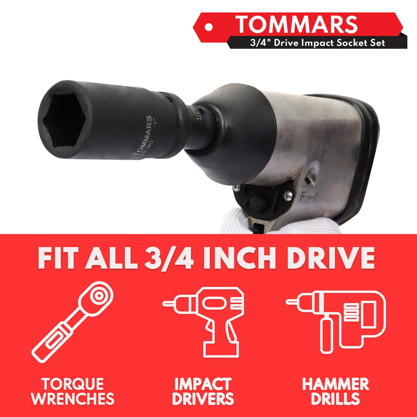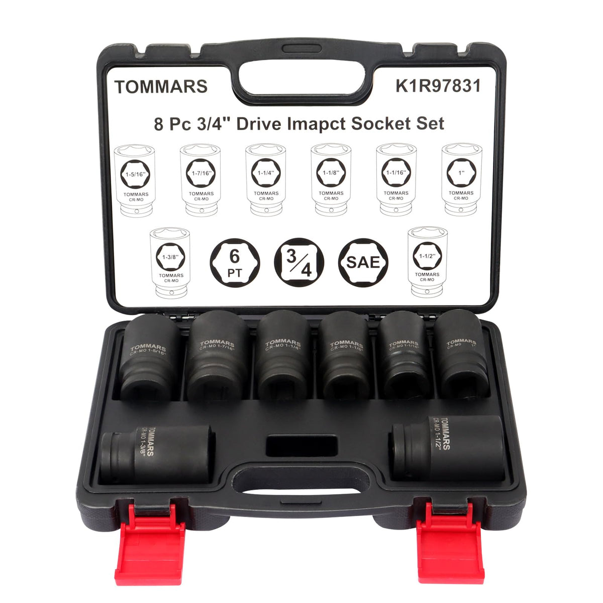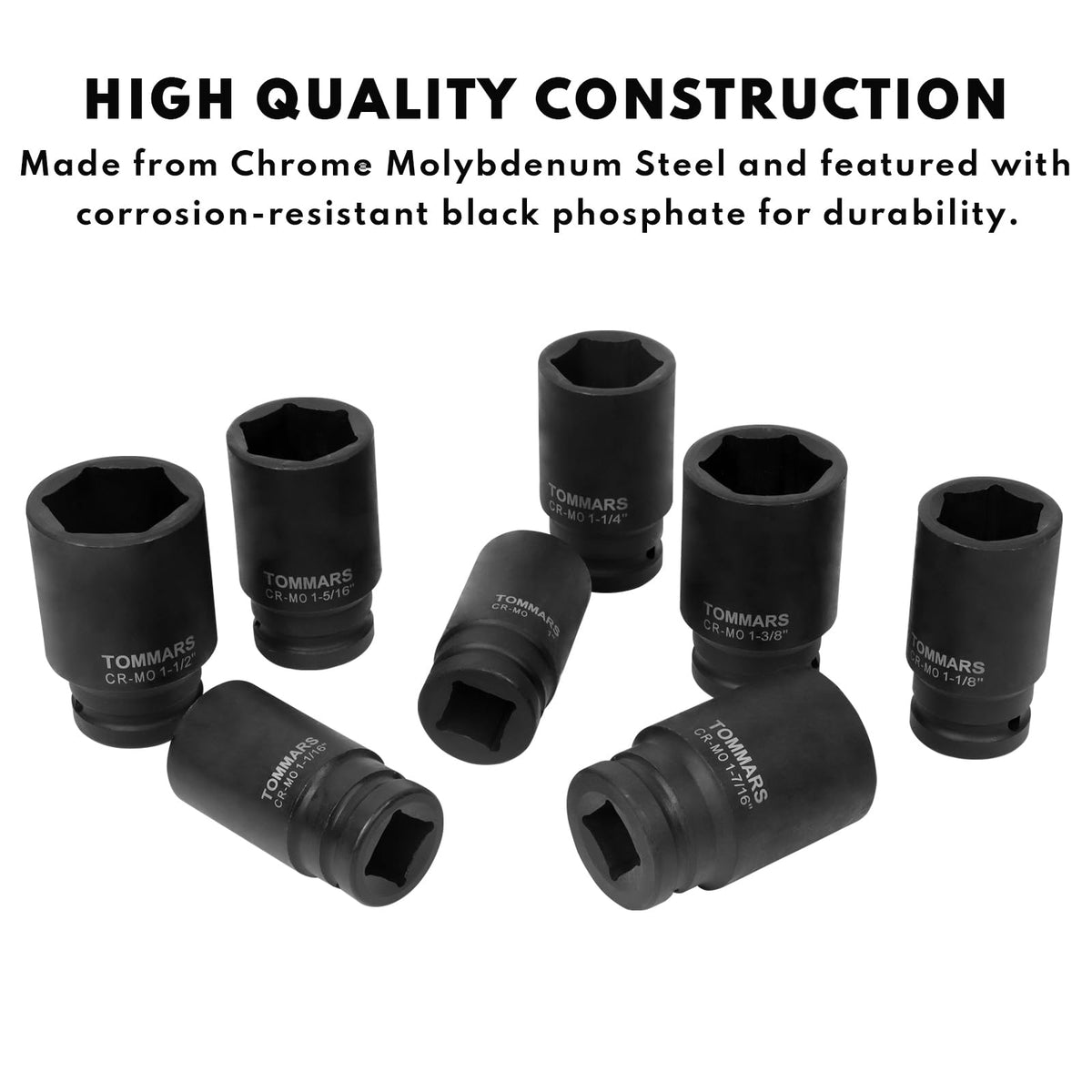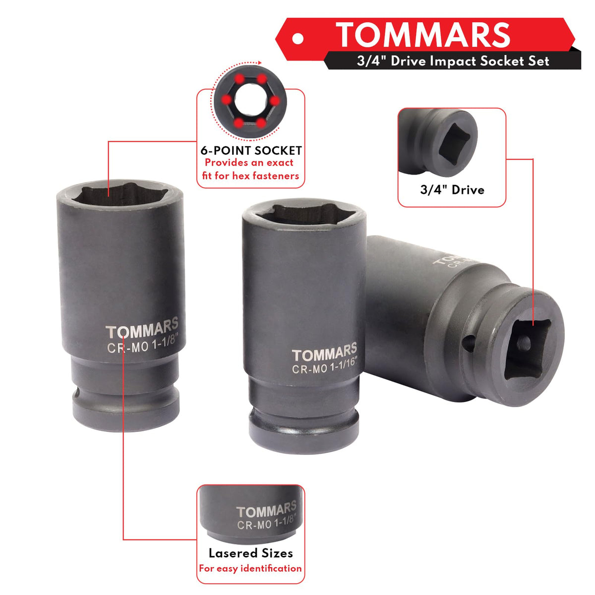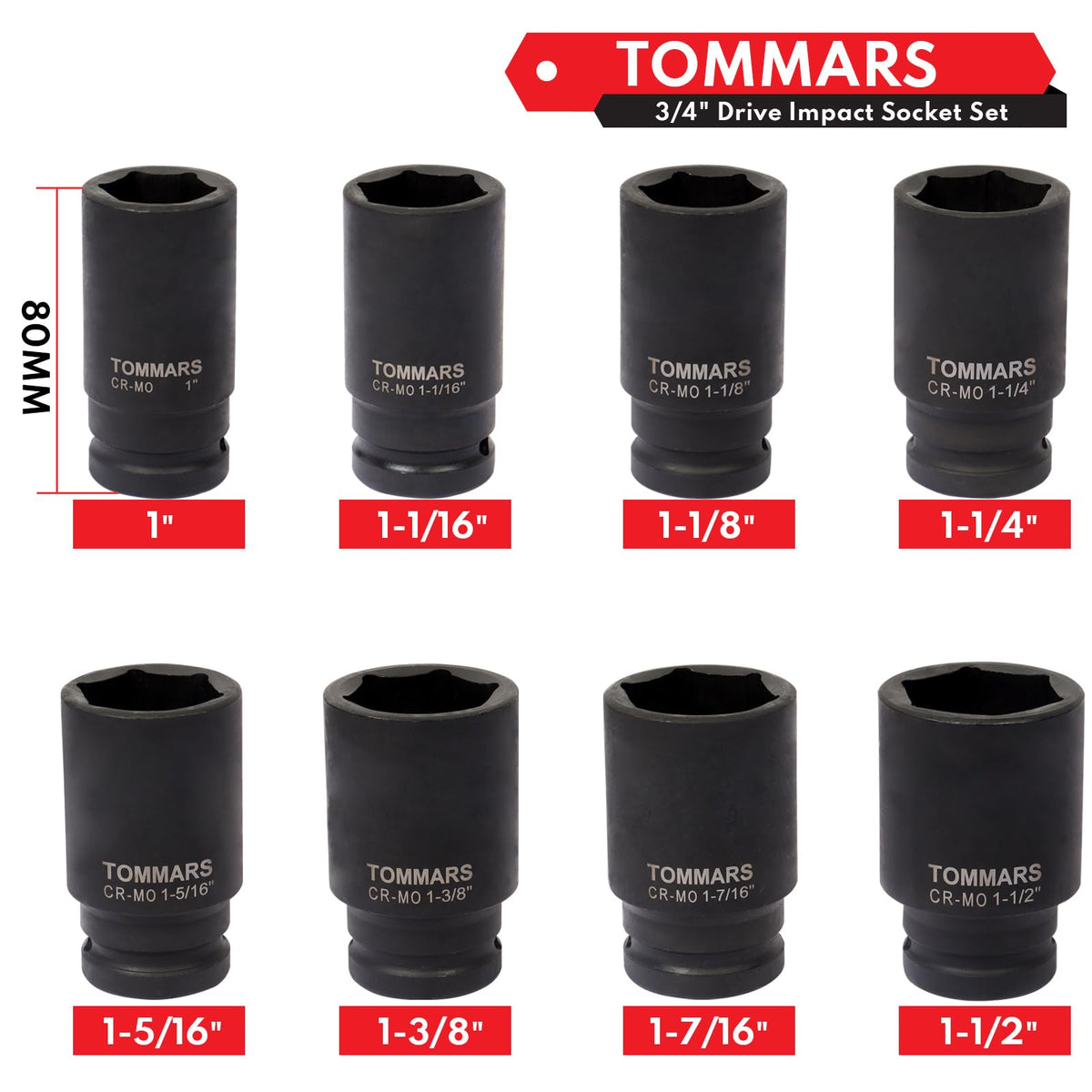 Tommars 6 Point Axle Nut Socket Set, 8-Pc 3/4 Inch Drive Deep Impact Socket Set, Cr-Mo, 1', 1-1/16', 1-1/8', 1-1/4', 1-5/16', 1-3/8', 1-7/16', 1-1/2' Sae Socket Set.