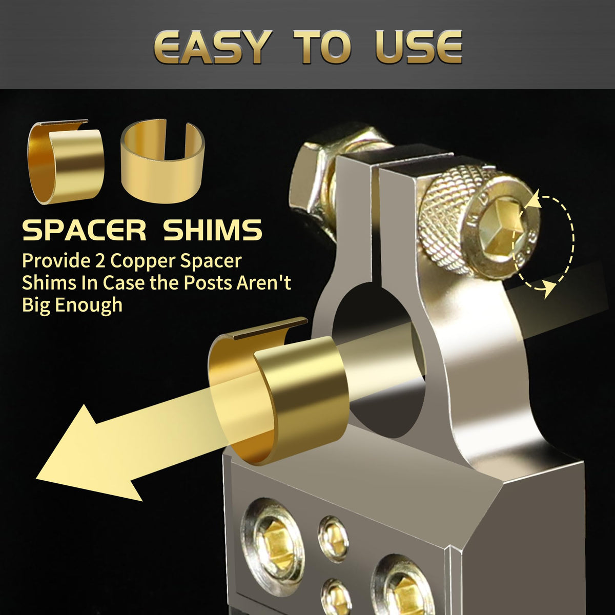 Q: How do the adjustable copper spacers work with these battery terminals?A: The adjustable copper spacers allow for flexible connections, ensuring a secure fit even when the tapered posts are not large enough. The shims indicate negative when installed in the terminal and positive when removed.