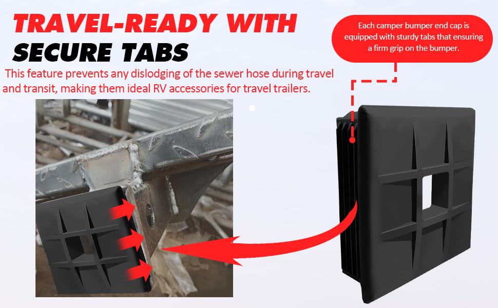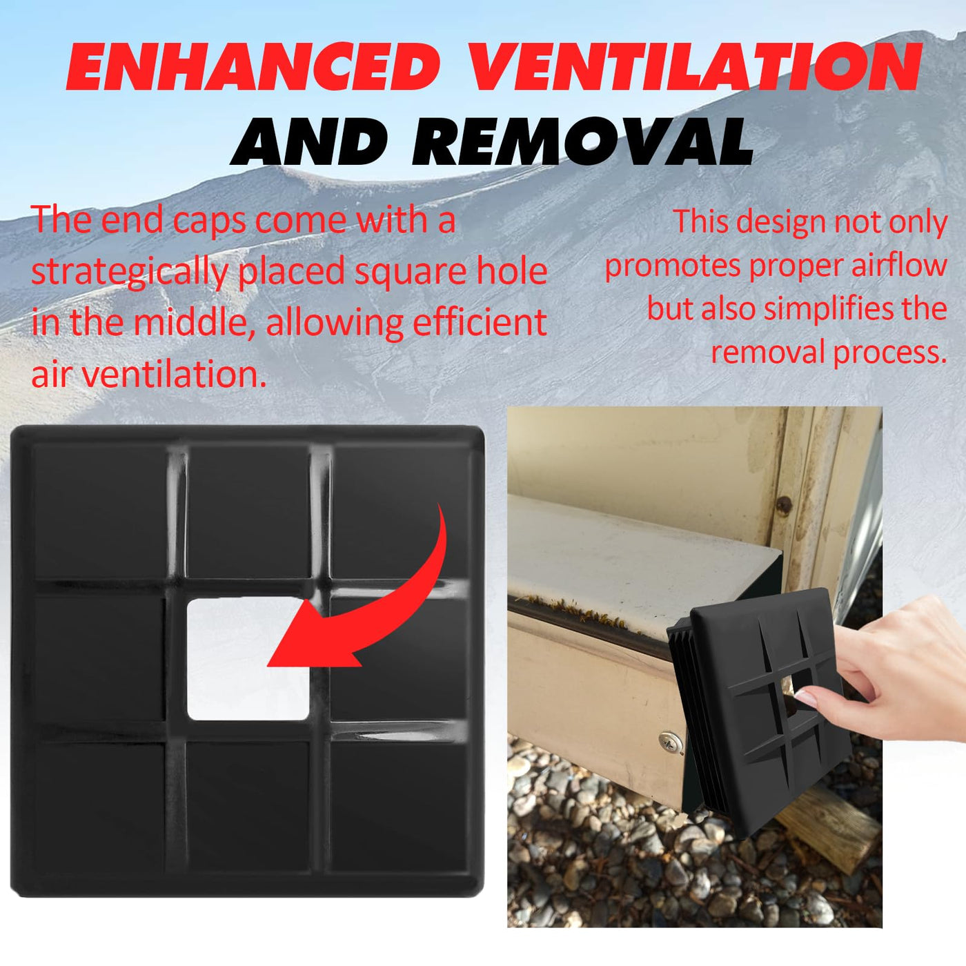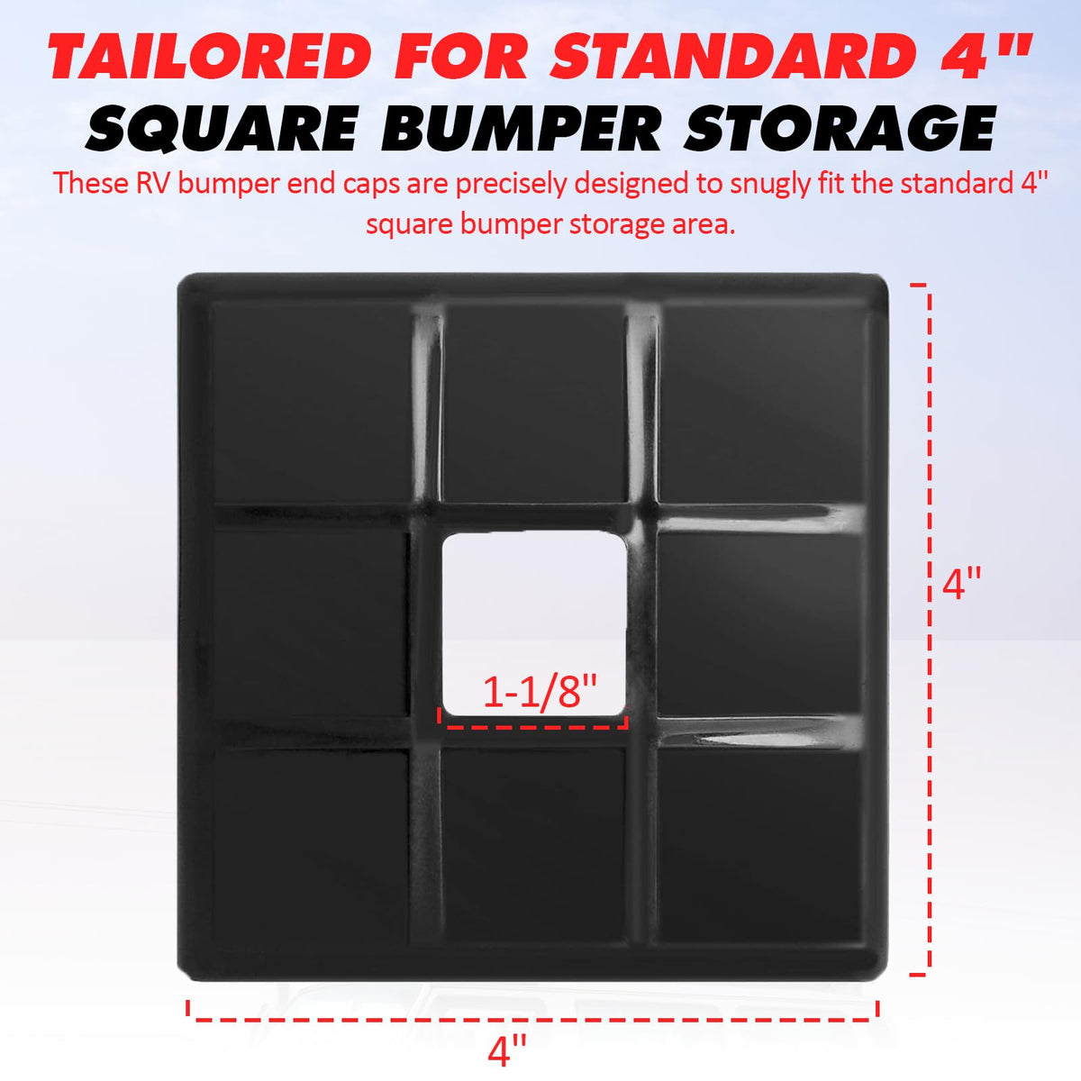 Tailored for Standard 4 Square Bumper Storage - These RV bumper end caps are precisely designed to snugly fit the standard 4 square bumper storage area, ensuring a secure enclosure for your sewer hose. Travel-Ready with Secure Tabs - Each camper bumper end cap is equipped with sturdy tabs that guarantee a firm grip on the bumper. This feature prevents any dislodging of the sewer hose during travel and transit, making them ideal RV accessories for travel trailers. Built to Last - Crafted from robust and durable PE materials, these RV bumper end caps offer exceptional longevity. They are designed for enduring use on your RV, camper, or travel trailer. Enhanced Ventilation and Removal - The end caps come with a strategically placed square hole in the middle, allowing efficient air ventilation. This design not only promotes proper airflow but also simplifies the removal process. Conveniently Packaged - Each package includes 2 or 4 packs of 4 Bumper Plug End Caps, making them a convenient addition to your RV accessories. These caps are each equipped with a 1-1/8 square vent hole for added ease of use.