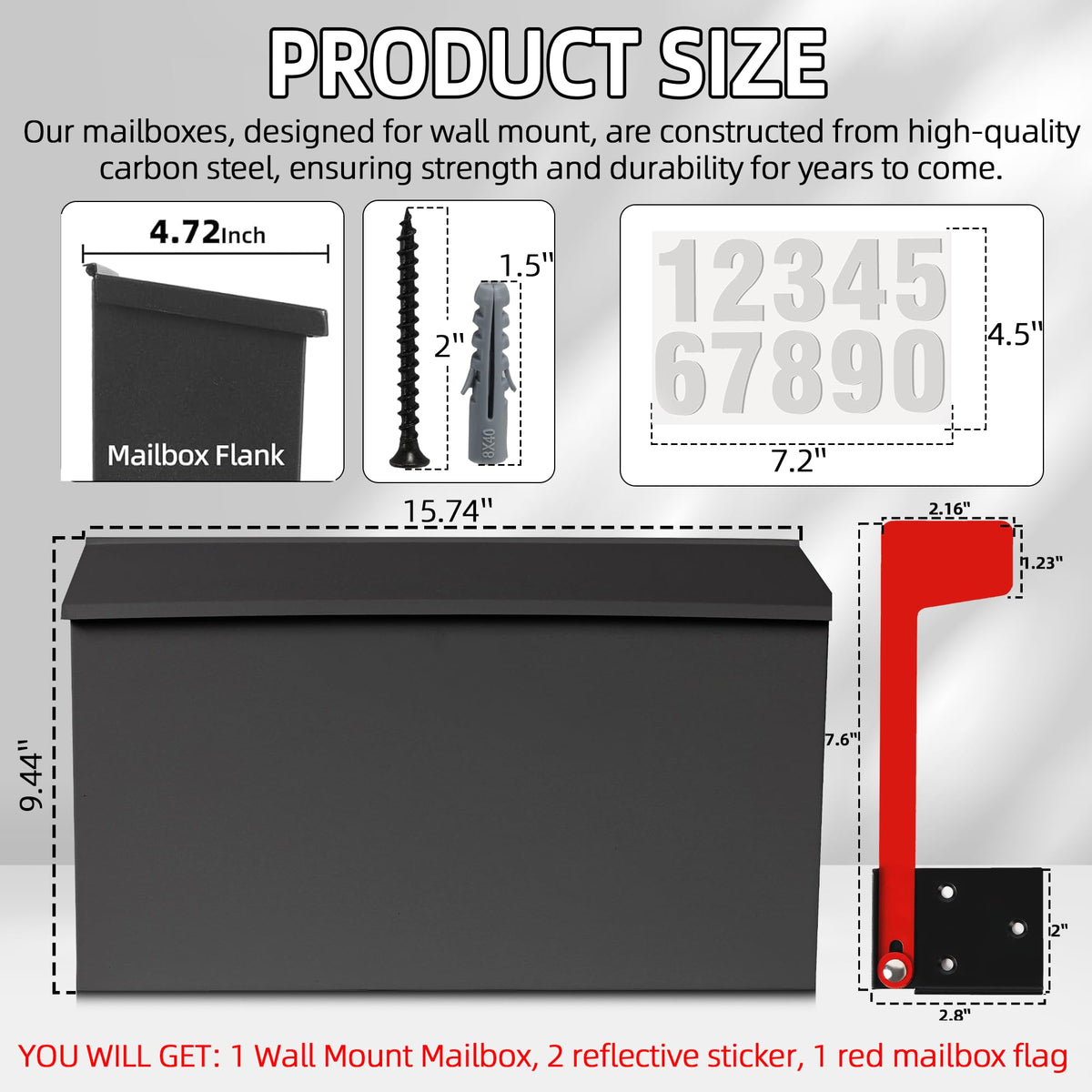 DURABLE AND LONG-LASTING: Our mailboxes, designed for wall mount, are constructed from high-quality carbon steel, ensuring strength and durability for years to come. This makes them ideal mailboxes for outside, capable of withstanding various weather conditions. RUST-RESISTANT FINISH: The painted finish on our mailbox is specially formulated to be rust-resistant, providing excellent protection against the elements. This makes it a reliable choice for wall mount mailboxes for outside, ensuring its pristine appearance even in harsh outdoor environments. SPACIOUS CAPACITY: With ample space to hold multiple letters, newspapers, and even rolled magazines, our mailbox offers the perfect solution for all your mail storage needs. Its generous size of 15.74"x9.44"x4.72" makes it an ideal mailbox for house use and ensures sufficient storage capacity. EASY INSTALLATION: Installing our wall mount mailbox is a breeze. It comes with pre-drilled holes and includes all the necessary installation hardware, making the process quick and hassle-free. Simply follow the provided instructions for a secure mailbox wall mount. Remember to install it under eave, awning, or porch for optimal protection and convenience. MODERN AND ELEGANT DESIGN: Our post box combines functionality with a stylish touch for your home's exterior. Its unique design and modern aesthetics make it a perfect choice for enhancing the overall look of your house. The environmentally friendly paint used ensures safety and adds to its appeal as a wall mount mailbox for outside.