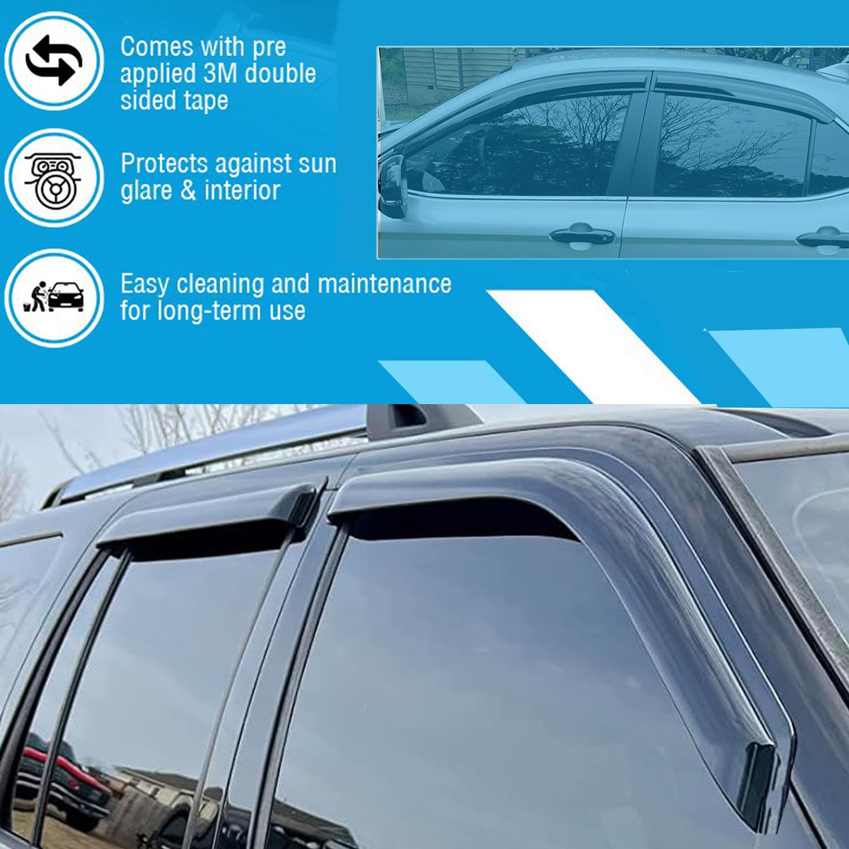 Car Window Rain Guards FitmentCompatible with Jeep Compass 2017-2024Note: Please check the display picture to see the cab difference and make sure your truck is the correct cab that this item will fit !!!Item-Offered4pcs vent guard shade window visors StyleOutside Mount Style, Easy Peel-N-Stick Installation. No Cutting or Drilling Required (Stick on to the door & above the windows.Not In-Channel Style)Position4pcs For Front & Rear (Driver & Passenger) VisorsMaterialReinforced AcrylicColorBlackFeatures1. This item is all new package upgrade products, Never used or installed.2. Comes With 3M Automotive-Grade Double-Sided Tapes.3. Fully window protected from sun shade, wind, rain, snow deflector.4. Helps to reduce heat build-up in parked vehicles by allowing windows to be partially open.5. High quality and durable plastic to withstand the rigors of the elements.6. Make it possible to leave the windows down a few inches to get fresh air even on rainy days.7. Dramatically improve your vehicel appearance.Car Window Rain Deflectors window guards car window deflectors rain guards window visor auto window deflectors vent visor car window rain guard window rain guards for cars rain guards for car rain guard window rain visor for car window auto window deflectors for wind deflectors for cars rain gards for car windows window guards for cars rain deflectors for car windows vent shades for car windows rain guard for car windows window deflectors for vehicles car window visor vent visors for cars window vents