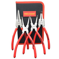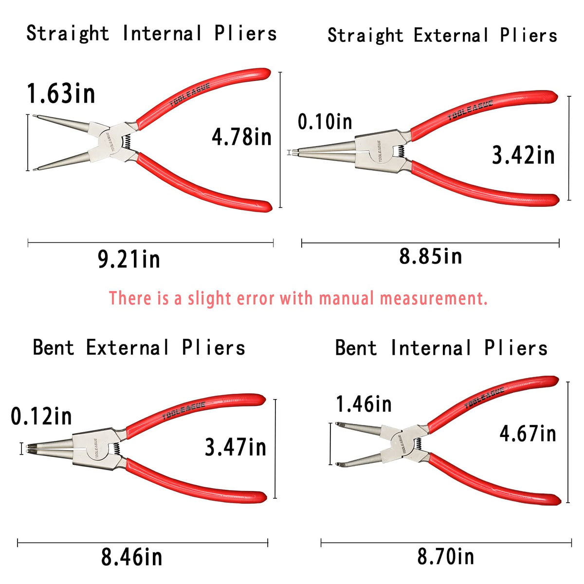 HIGH QUALITY: TOOLEAGUE circlip pliers with a forged and hardened CR-V steel construction, Each snap ring plier is treated with nickel and iron to improve corrosion resistance. The high-quality quality guarantees the repeated use and long-term use of the product. | REASONABLE DESIGN: The snap ring pliers adopt the ergonomic design, non-slip handles, high-quality springs, stable opening and closing, perfect control of the whole, and provide users with a comfortable working experience. | LABOR-SAVING DESIGN: One-piece 90-degree folding corners, refuse to break, easy to manipulate, and have a longer service life. Owning a good circlip plier can make your work easier and improve efficiency. | WIDE RANGE OF USES: used in equipment, machinery industry, industrial assembly, household appliances, vehicles and other DIY maintenance, such as bicycles, agricultural machinery, locks, and other bearings fixed installation and disassembly | WHAT YOU GET: 1x Straight Internal Plier, 1x Bent Internal Plier, 1x Straight External Plier, 1 x Bent External Plier, 1 storage bag. It is convenient for better storage and carrying.