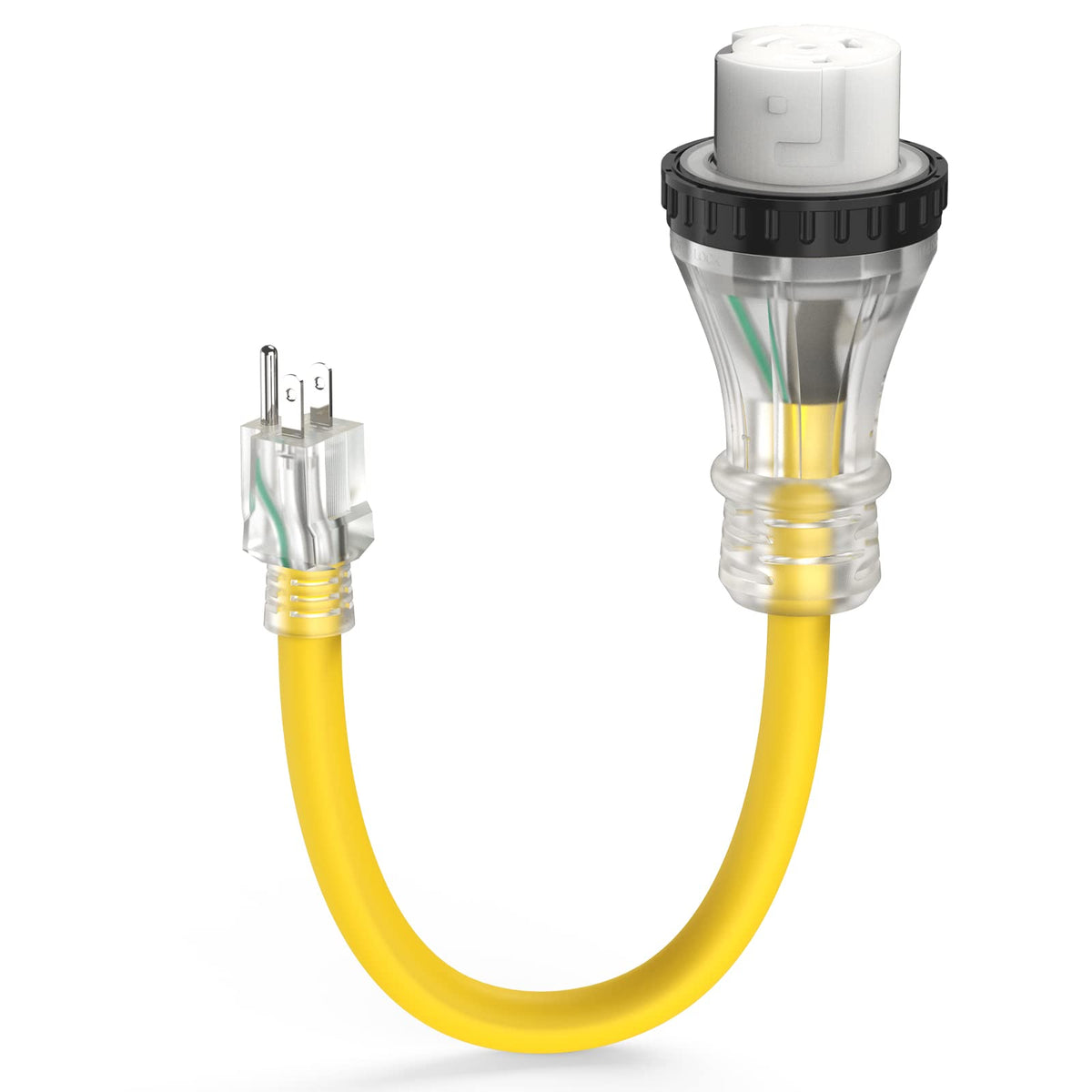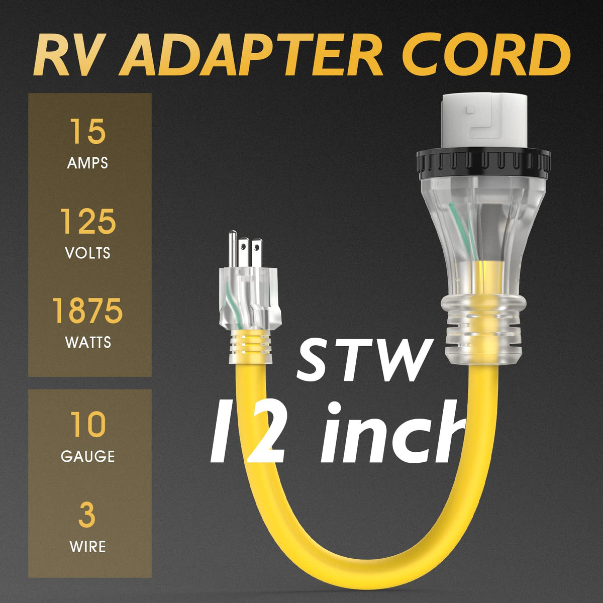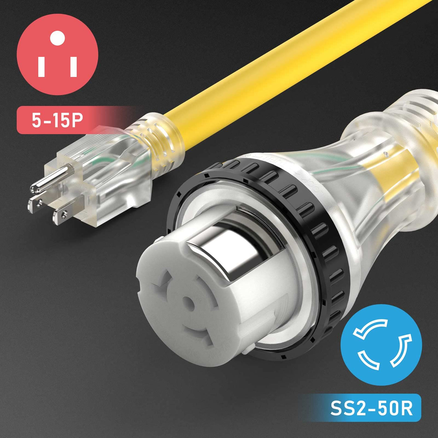 50 Amp to 15 Amp Locking RV Adapter:NEMA 15A 5-15P male plug to 50A SS2-50R female receptacle,125Volt,Load 1875 Watt 12" length adapter | Twisted Locking Design :Equipped with a threaded ring, simply twist it to lock so the power cord stay on RV firmly that can achieve weatherproof. | High Conductivity: Constructed with UL certified 10 gauge heavy duty pure copper wire to ensure the good electrical conductivity. | Safe and Durable: Dogbone adapter cord coated with a heavy-duty flame retardant, heat-resistant PVC sheath that serves as protection from wear and tear, as well as outdoor elements. | Converts Electrical Connection:Designed to allow you to hookup while home or RV camper park, adapting the electrical connection to fit your 50 amp RV.