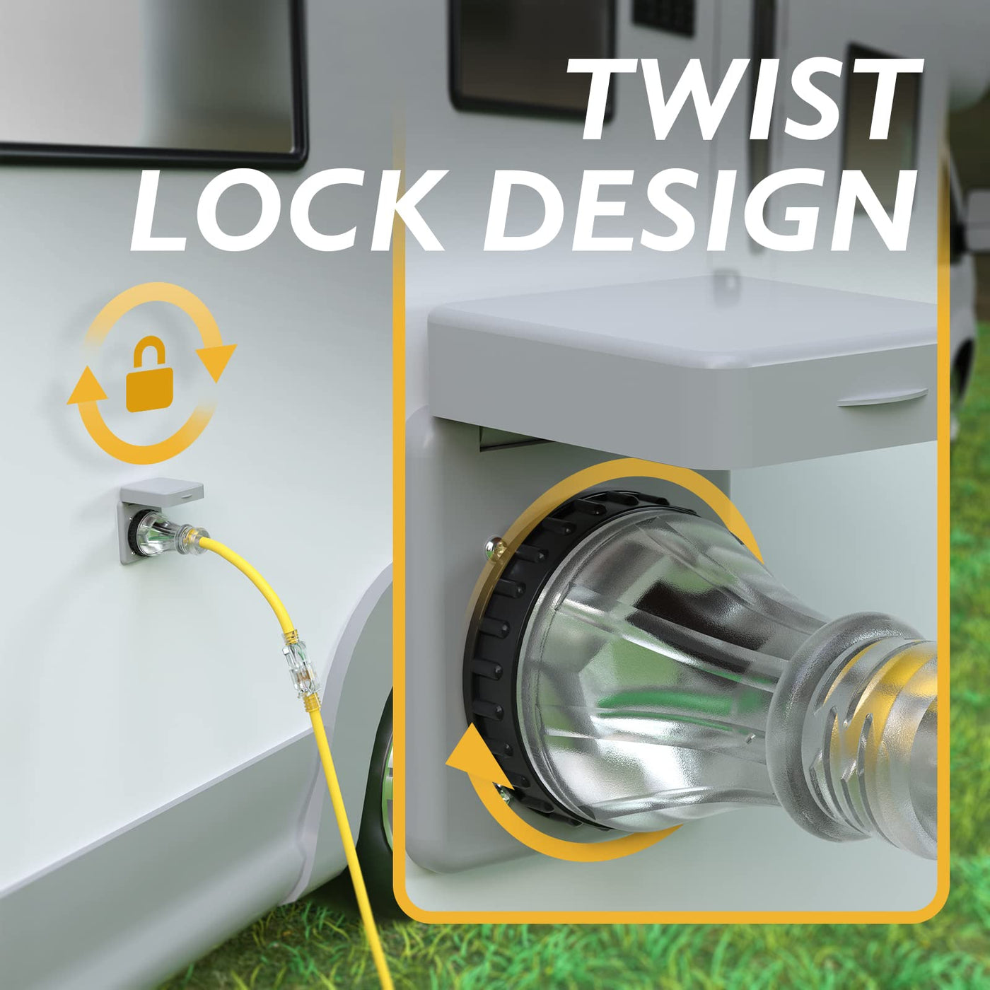 Q: How does the twist lock feature work on this RV adapter?A: The twist lock feature on the TOOLIOM RV adapter uses a threaded ring that securely locks the power cord in place, ensuring a firm connection that prevents accidental disconnections and improves weatherproofing.