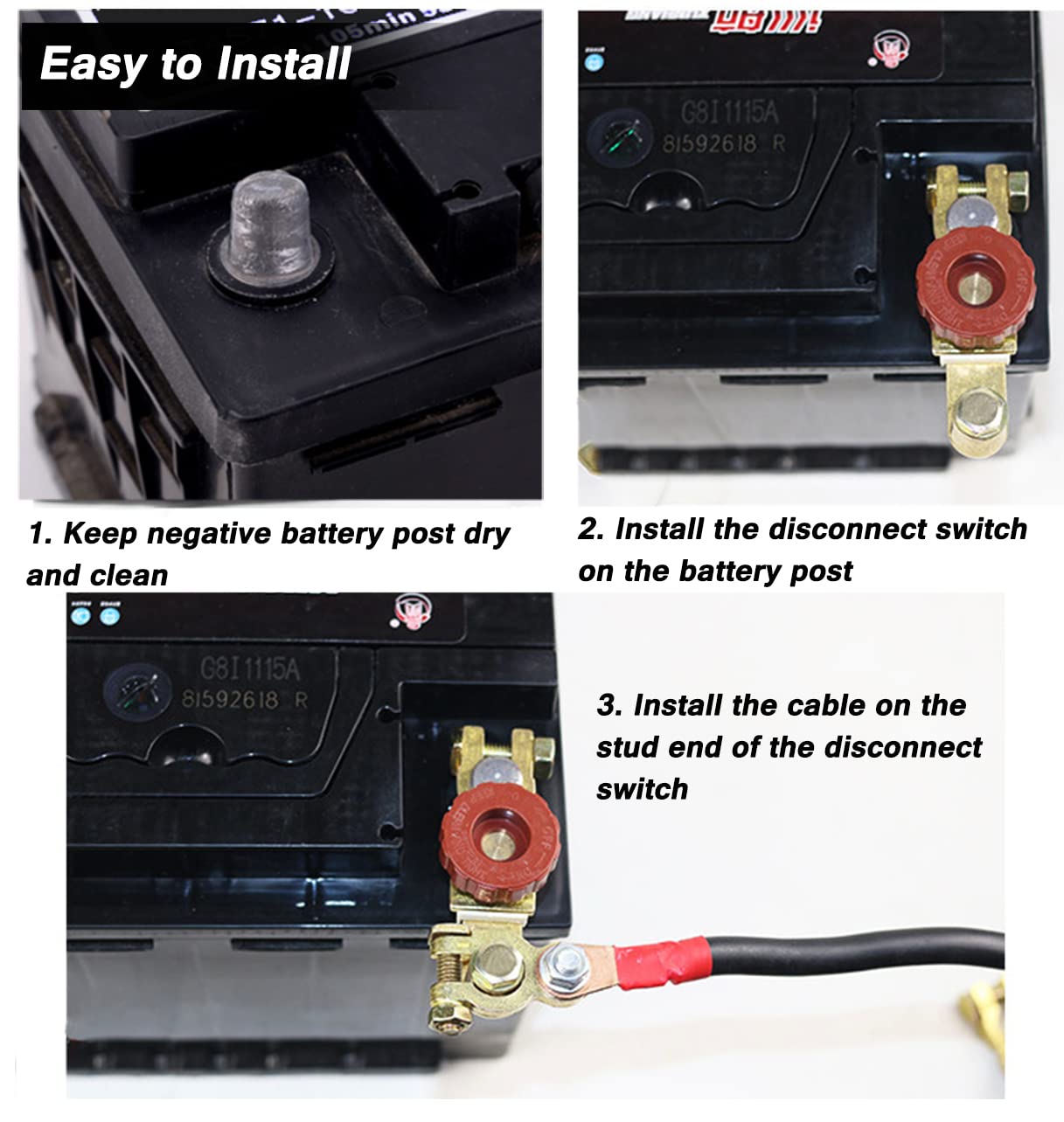 Q: How do I install and use the battery disconnect switch?A: Installation is straightforward; simply follow the included instructions to unscrew or tighten the knob to switch between the 'on' and 'off' positions, effectively controlling the battery current.