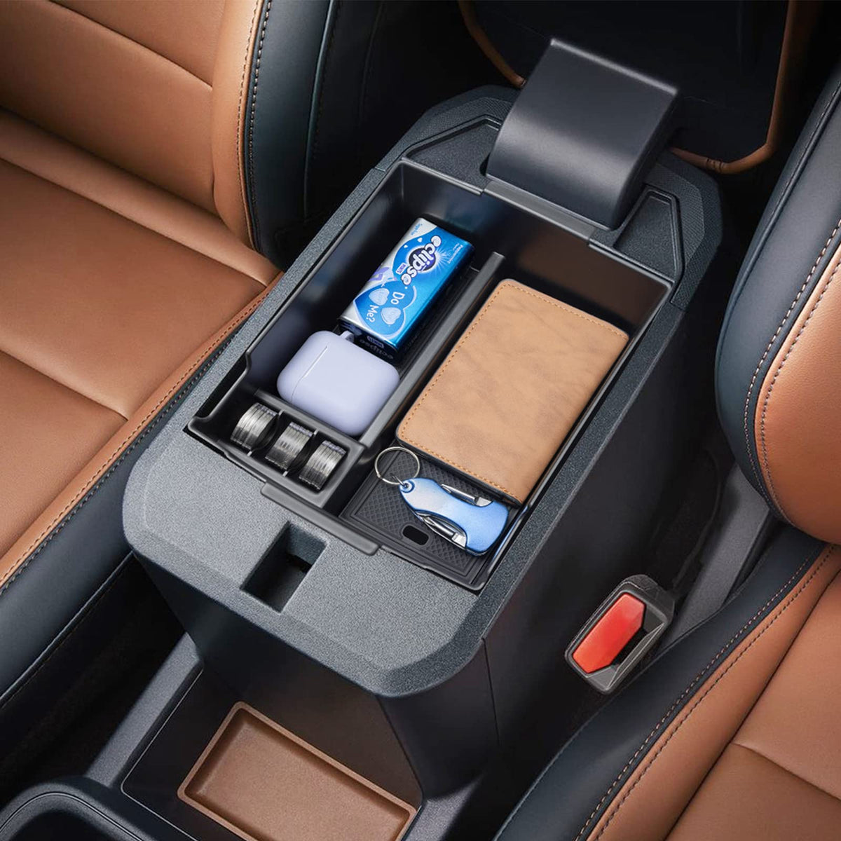 Q: How does the console organizer improve storage in my Ford Maverick?A: The tray features three compartments that help separate and organize small items like coins, phones, and glasses, while also providing ample space below for larger items, making it easier to find what you need without rummaging.