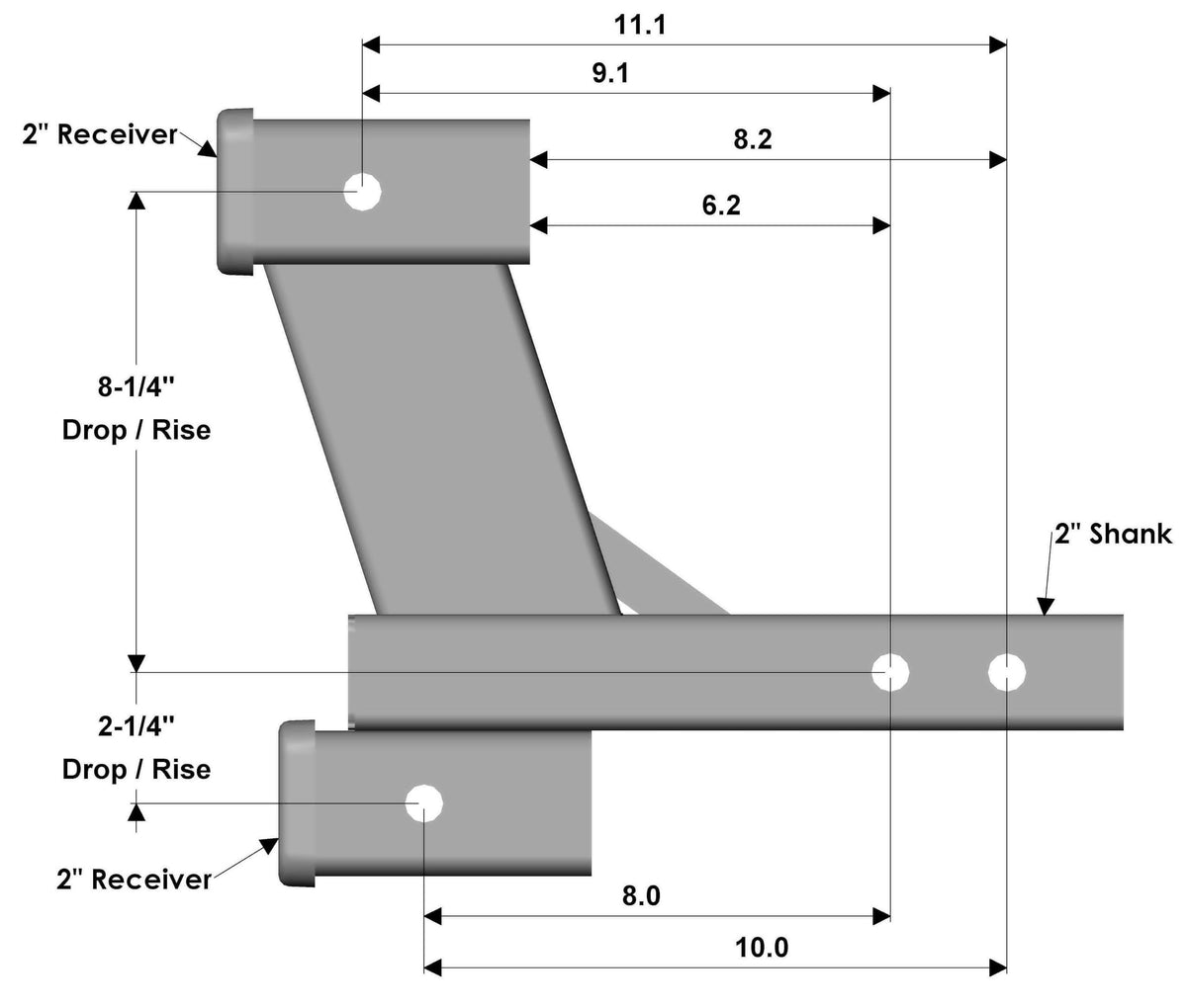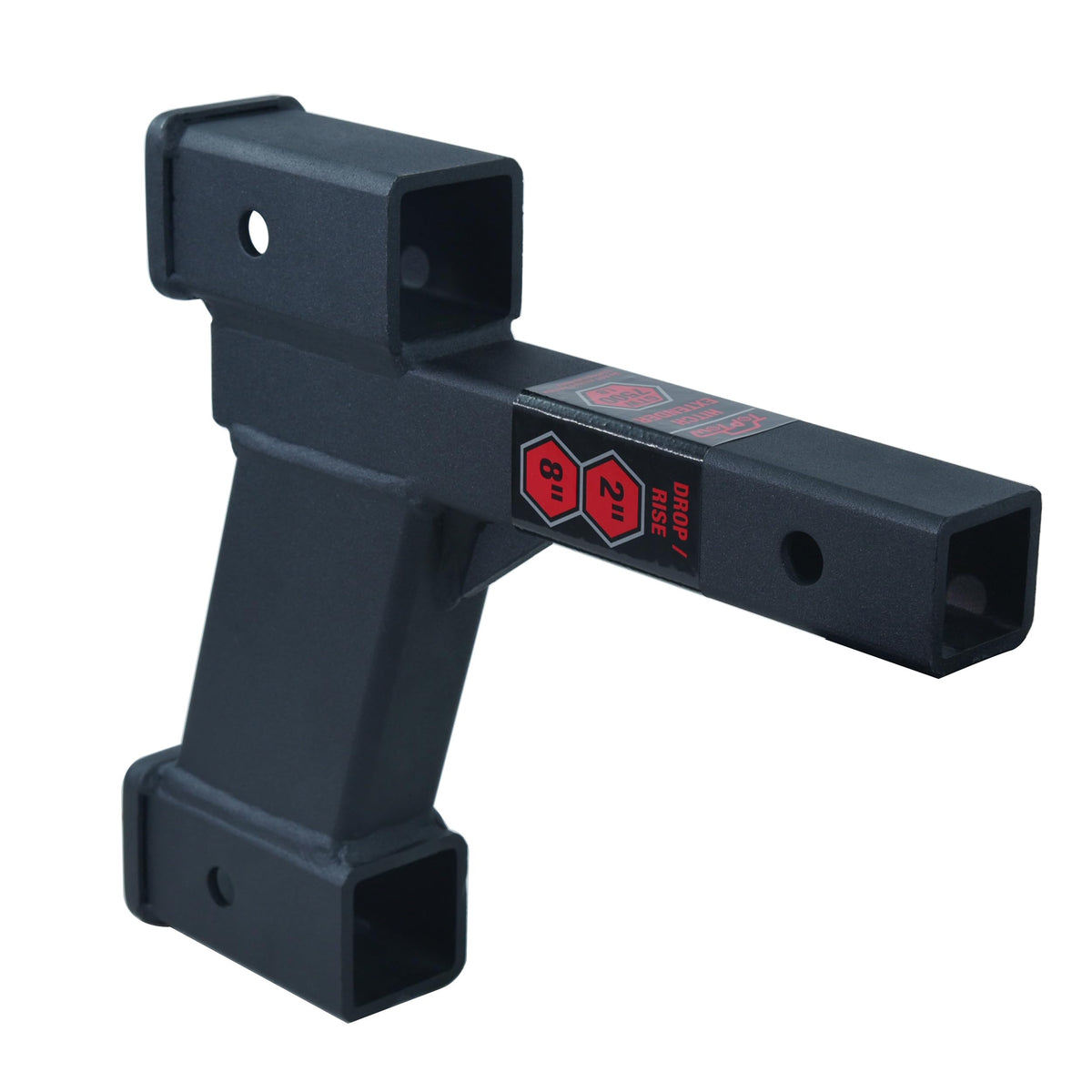 TOPTOW is branded trailering ang towing accessories supplier. We makes quality products for RV, towing, tailgating, off-road recoverying and trailering like ball hitches, drop hitches, hitch extenders, hitch adapters, RV bumper hitches, trailer coupler locks, hitch locks, hitch pins, cargo carriers, bike racks, etc. The new designed dual hitch extension receiver can provide an extra room to tow and carry a bike rack or cargo carrier simultaneously. Vehicles that have spare tire in the back may not fit. Please check the dimension for clearance. Capacity can be rated up to 7,500 lbs GTW and 400 lbs Tongue Weight; 8-1/4'' and 2-1/4'' inches rise or drop can fit more different sizes of accessories; 2 pin holes design allows adjustable length to fit different kinds of receivers; Anti-rattle design helps eliminate the rattle,noise,movement and rocking; Matte Black powder finish, not only has an astounding looking, but also enhanced corrosion resistance. TOPTOW dual hitch extension, your right choice to buy.
