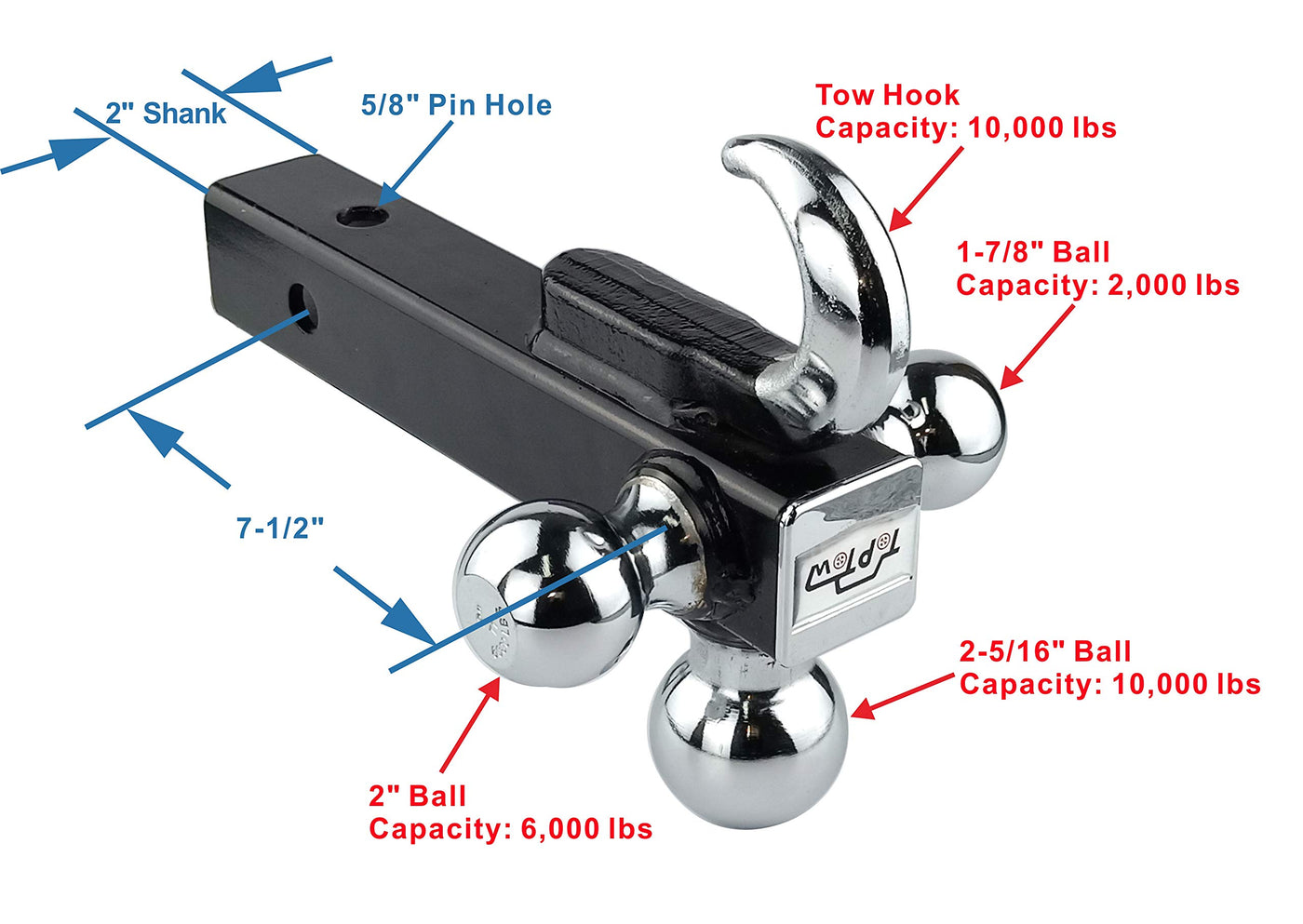 This multi-ball mount design enable for fast and easy switch between ball sizes. No need to install or buy another entirely different ball mount every cases. As well no need to remove a hitch ball and Reload a new one. Ball mount features 3 permanently attached hitch balls to fit different applications. Tow up to 2,000 lbs with the 1-7/8' ball; 6,000lbs with 2' ball; or 10,000 lbs with the 2-5/16' ball. 5/8 inch Hitch lock was included. * Fits 2' Trailer Hitch Receivers * 3 Different-size hitch balls let you tow trailers fit for different coupler sizes 1-7/8' Ball - GTW/TW: 2,000lbs/200lbs 2' Ball - GTW/TW: 6,000LBS/600lbs 2-5/16' Ball - GTW/TW: 10,000LBS/1,000lbs Hook - GTW/TW: 10,000LBS/1,000lbs * To switch ball, simply remove, rotate and reinsert drawbar * Hitch balls are permanently attached; Chrome plated prevent the rust and corrosion * Hollow shank is sturdy yet light weight * Hitch lock keep your ball mount safe * Black powder coated steel is durable and corrosion resistant
