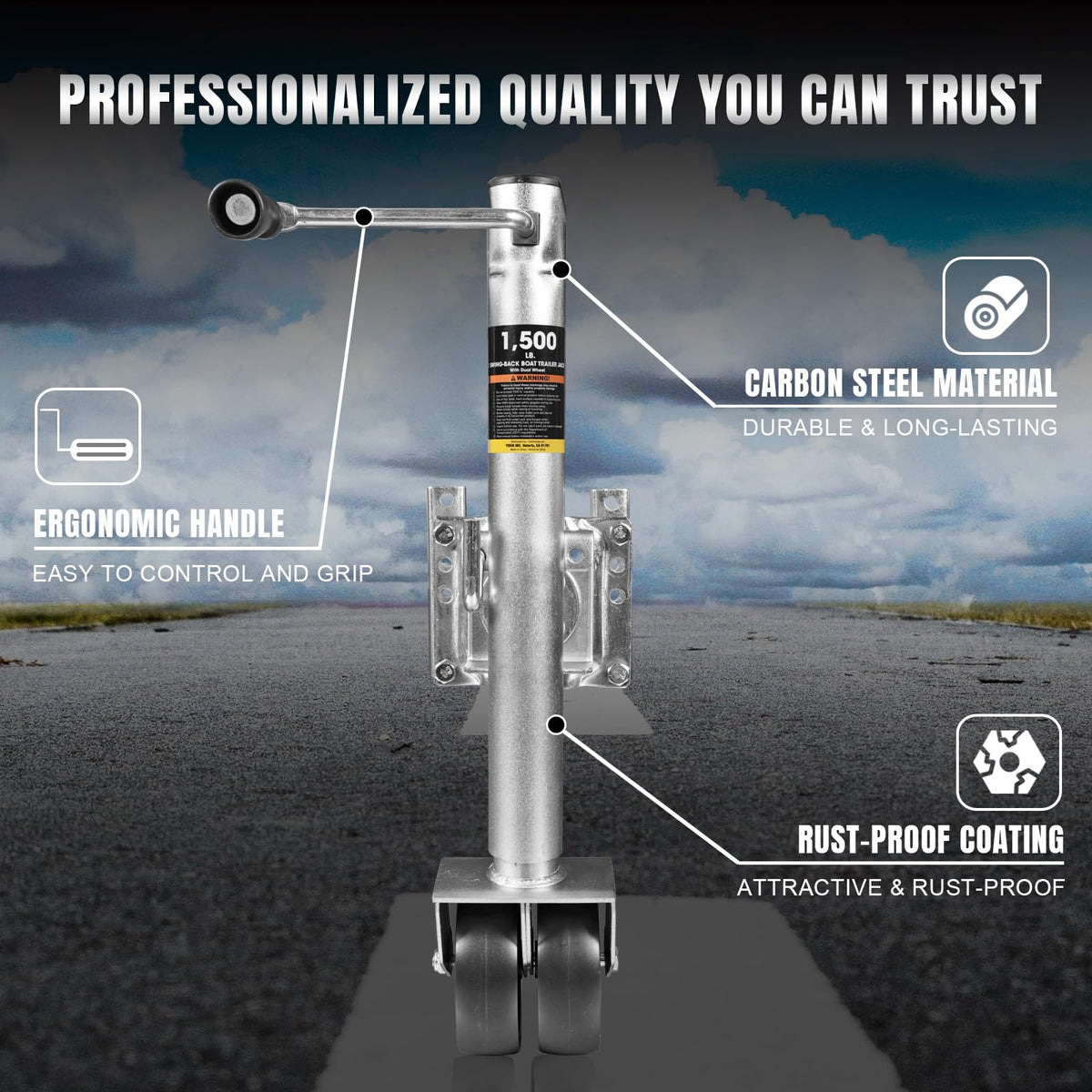 Torin Boat Trailer Jack with Dual Wheel swing-back bolt-on trailer jack easily raises and lowers any trailer up-to a 3/4 ton (1,500 lb) capacity.Adjustable height from13.87-27.5''; Painted with Zinc, which is corrosion resistant.Convenient wind handle delivers fast, smooth cranking,Equipped with (2) sturdy 6'' wheels that provide low-friction mobility, allowing you to move your trailer into position easily.Includes a limited 1 year manufacturer warranty.This strong boat jack can be used for many things. It is great for lifting travel, horse, or multipurpose trailers. It has a removable handle so you can use it by hand in case there is a power outage or emergency.