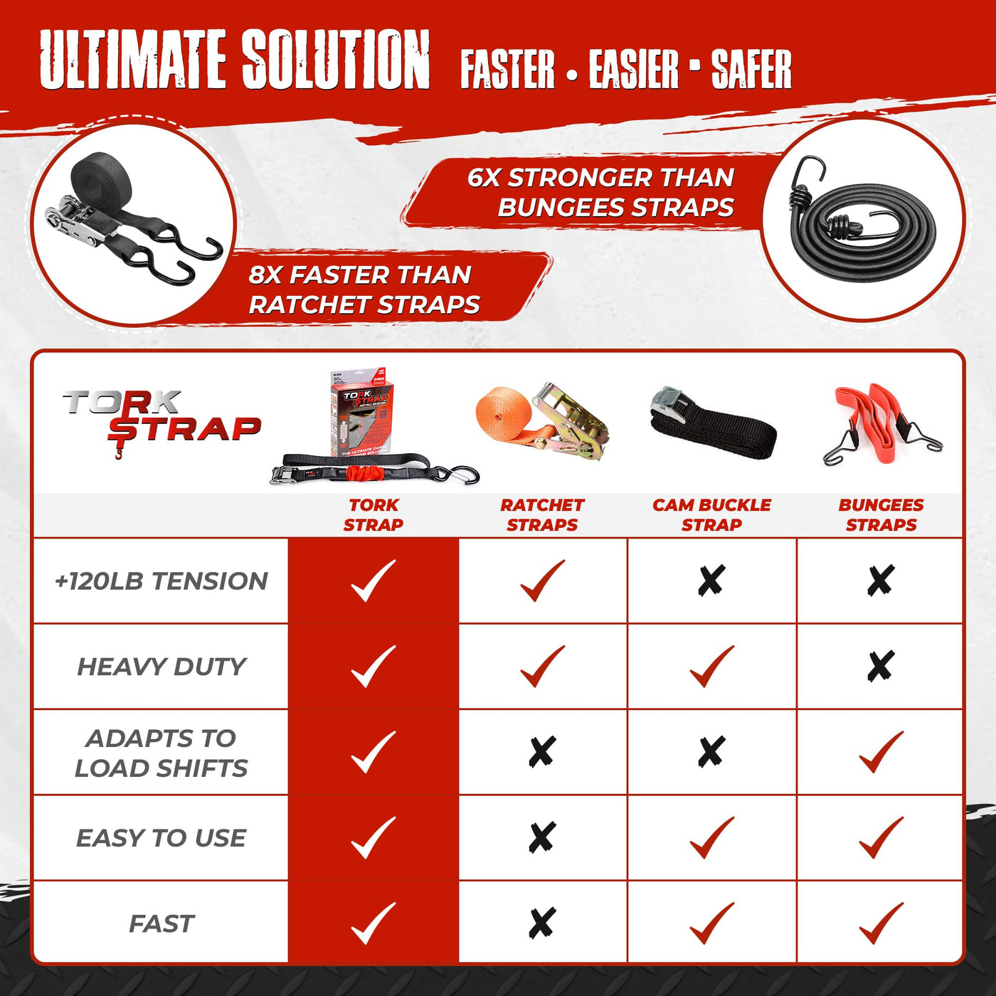Innovative Hybrid Design: At TorkStrap we've combined the ease of bungee cords with the strength of ratchet straps, creating a hybrid tie-down that simplifies your cargo securing process. No more fumbling with hooks, ratchets, or complex mechanisms - TorkStrap does it differently. Adaptive Technology: Thanks to our patent-pending adaptive technology, TorkStrap adjusts to load shifts during transport. This means your cargo stays securely fastened without constant readjustment. Whether you're moving heavy items, using it as moving straps, or securing gear for an outdoor adventure, TorkStrap's innovative design ensures peace of mind. Strength and Reliability: Our TorkStrap Model 500 is engineered for exceptional performance. With an impressive 14-foot length, it boasts a 500lbs Safe Work Load and a robust 1500lbs Max Load. This means you can rely on TorkStrap for a wide range of applications, from securing your ATV, truck accessories, and motorbike to transporting a kayak or even the cherished Christmas tree during the holidays. TorkStrap can handle it all. Versatility in Action: TorkStrap isn't limited to one use. It's perfect for trucks, whether you need to strap down cargo or secure your accessories. Motorbike enthusiasts and off-road adventurers appreciate its reliability when hitting the trails. Kayaking trips become stress-free with TorkStrap's secure hold, and even your Christmas tree can make it home safely without a hitch. Choose Your Level: TorkStrap offers flexibility with options for both standard and PLATINUM models, catering to various load requirements. We understand that not all cargo is the same, so we've designed our straps to meet your specific needs. Proudly Made in the USA: Quality matters to us, which is why TorkStrap is handcrafted in the USA using a combination of foreign and domestic parts. By choosing TorkStrap, you're not only investing in a superior cargo securing solution but also supporting local craftsmanship.