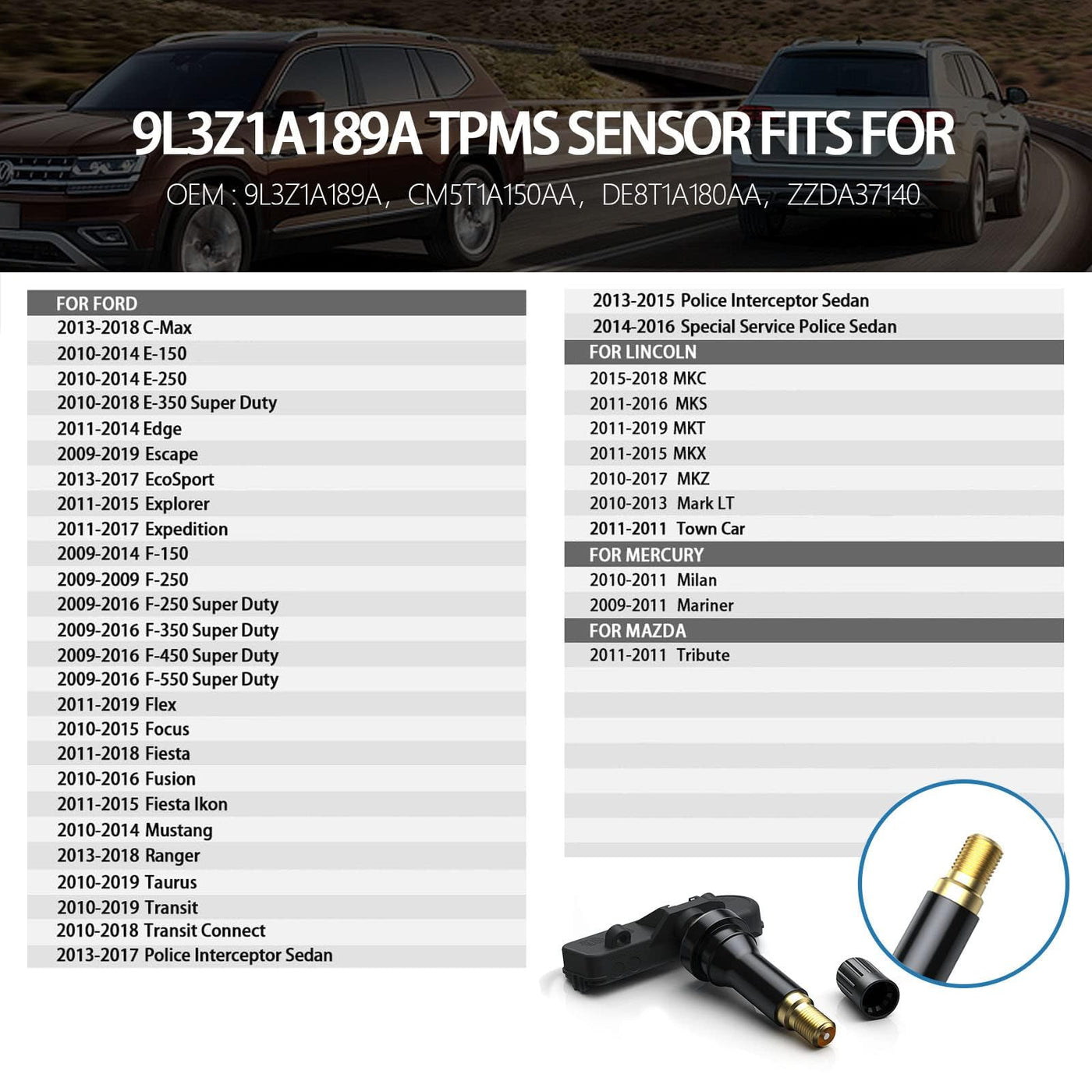 ?Compatible with 1?TPMS sensor fits for Ford Escape 2009-2019, F-150 2009-2014, F-350 Super Duty 2009-2016, F-450 Super Duty 2009-2016, F-250 2009, F-250 Super Duty 2009-2016, F-550 Super Duty 2009-2016, E-150 2010-2014, E-350 Super Duty 2010-2018, Focus 2010-2015, Fusion 2010-2016, Mustang 2010-2014, Transit Connect 2010-2018, Taurus 2010-2019, Transit 2010-2019, Edge 2011-2014, Expedition 2011-2017, Explorer 2011-2015, Fiesta 2011-2018, Flex 2011-2019, Fiesta Ikon 2011-2015. | ?Compatible with 2?Tire pressure sensor fits for Ford C-Max 2013-2018, EcoSport 2013-2017, Ranger 2013-2017, Police Interceptor Sedan 2013-2017, Police Interceptor Utility 2013-2015, Special Service Police Sedan 2014-2016, Mercury Mariner 2009-2011, Milan 2010 2011, for Lincoln MKZ 2010-2017, Mark LT 2010-2013, MKT 2011-2019, MKX 2011-2015, Navigator 2011-2017, Town Car 2011,MKS 2011-2016, MKC 2015-2018, Tribute 2011, Please check again before purchase to avoid issues and extra money out. | ?Replace OE Number?9L3Z-1A-189-A, 9L3Z1A189A, 9L3Z-1A189A, DE8T-1A-180-A, DE8T1A180AA, DE8T-1A180-AA, CM5T1A150AA, ZZDA37140, DE8T-1A150-AA, 9L3Z-1A189-A, 9L3T-1A180-AE, 9L3T-1A180-AF, 9L3T-1A180-BB, 9L3T-1A180-CA, 9L3T-1A150-BE, CM5T-1A150-AA, CM5T-1A180-AA | ?Easy to Install and Relearn?TMPS sensors kit had pre-programmed for your vehicle the same as factory, the tire sensors fit for F-150 are manufactured to OEM specification, You can DIY or to professional tire shops, just follow car manufacturers instructions to turn off and on, relearning, programming, activation and running. | ?Long Lasted Battery?Tire pressure system OE replacement is upgrade with an powerful automotive-grade battery for long last 5-8 years or 90000-120000 kilometers, the tire pressure sensors for MKZ 200 operating temperature range to -40?~+125? ensure the safety during you driving in every conditions.