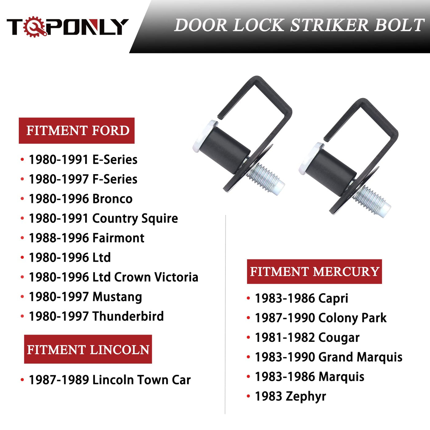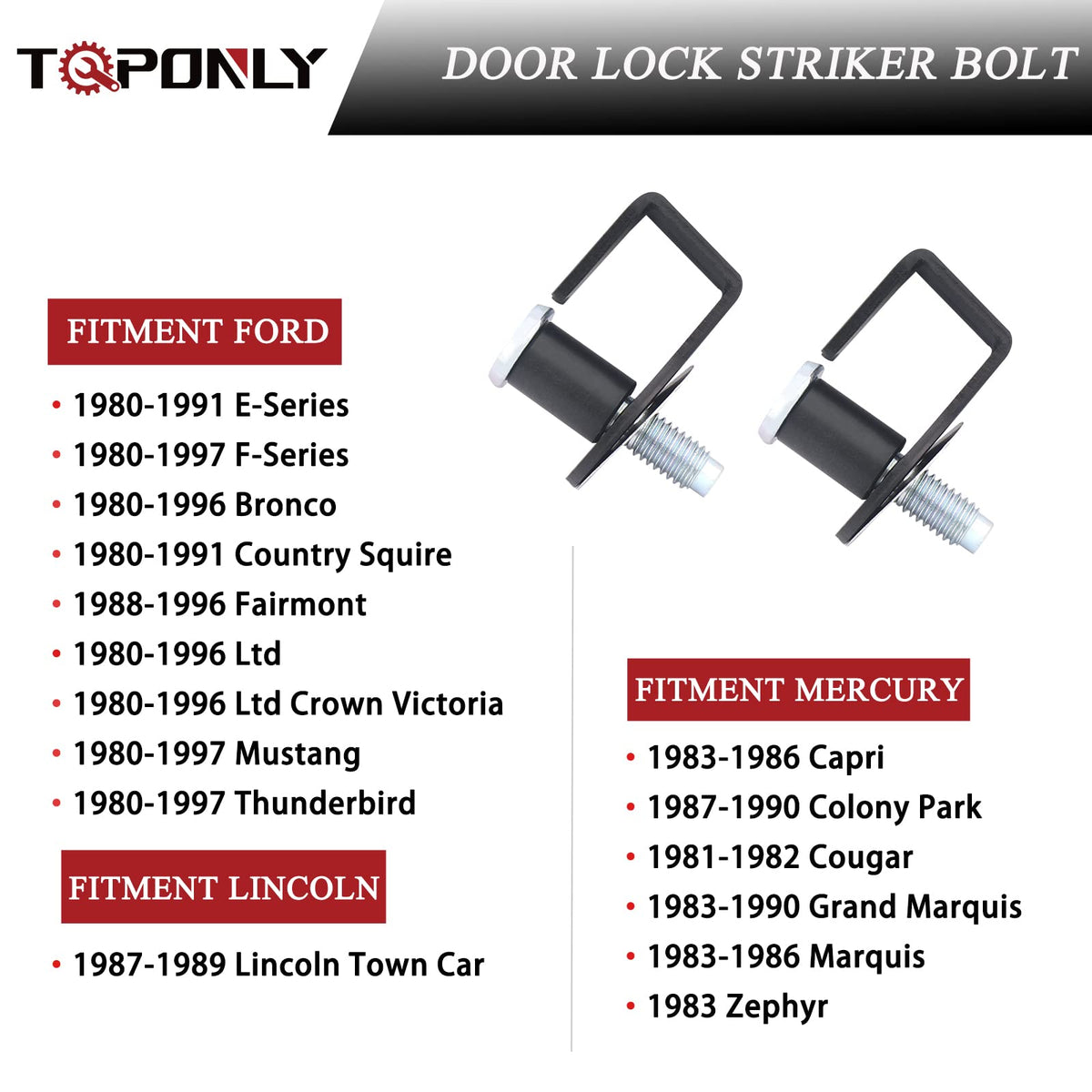 Q: What vehicles are compatible with the TQPONLY Door Striker Bolt?A: The TQPONLY Door Striker Bolt is compatible with a range of vehicles including 1980-1997 Ford models such as the E-Series, F-Series, and Mustang, as well as 1987-1989 Lincoln Town Car and various Mercury models from 1981-1990.