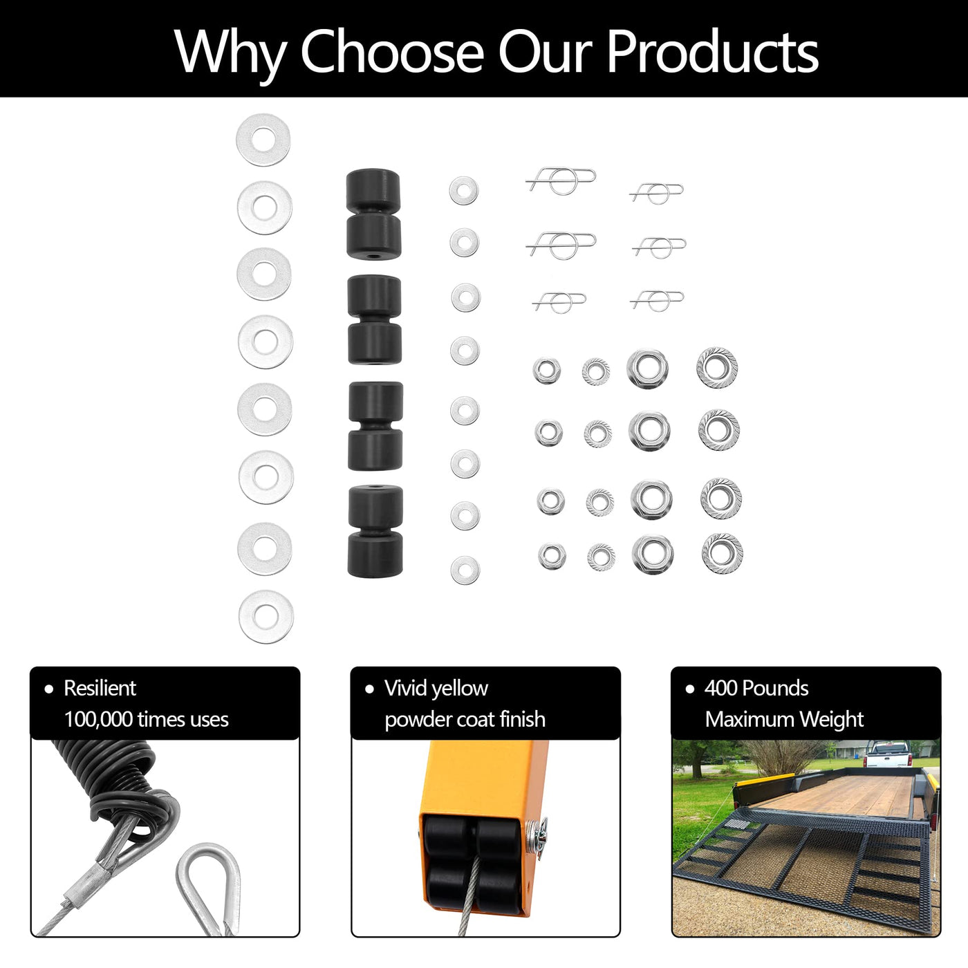 Package Included: 2x housing with an angle cut on one end 2x housing with square cuts on both end 8x 5/16-inch x 2 1/2-inch mounting bolt 8x 5/16-inch flat washer 8x 5/16-inch flanged lock nut 2x spring/cable assembly 2x 1/2-inch clevis pin 2x 1/2-inch locking ring 4x aluminum alloy roller 4x 1/4-inch clevis pin 4x 1/4-inch flat washer 4x 1/4-inch locking ring 2x 1/2-inch x 5 1/2-inch gate attachment bolt 4x 1/2-inch flanged lock nut 8x 1/2-inch flat washer 2x S-Hook Condition: New Compatible with: Trailers with side rails 10 to 24 inches above bed Tailgates or ramps 4 to 6 feet in height Maximum tailgate or ramp weight cannot