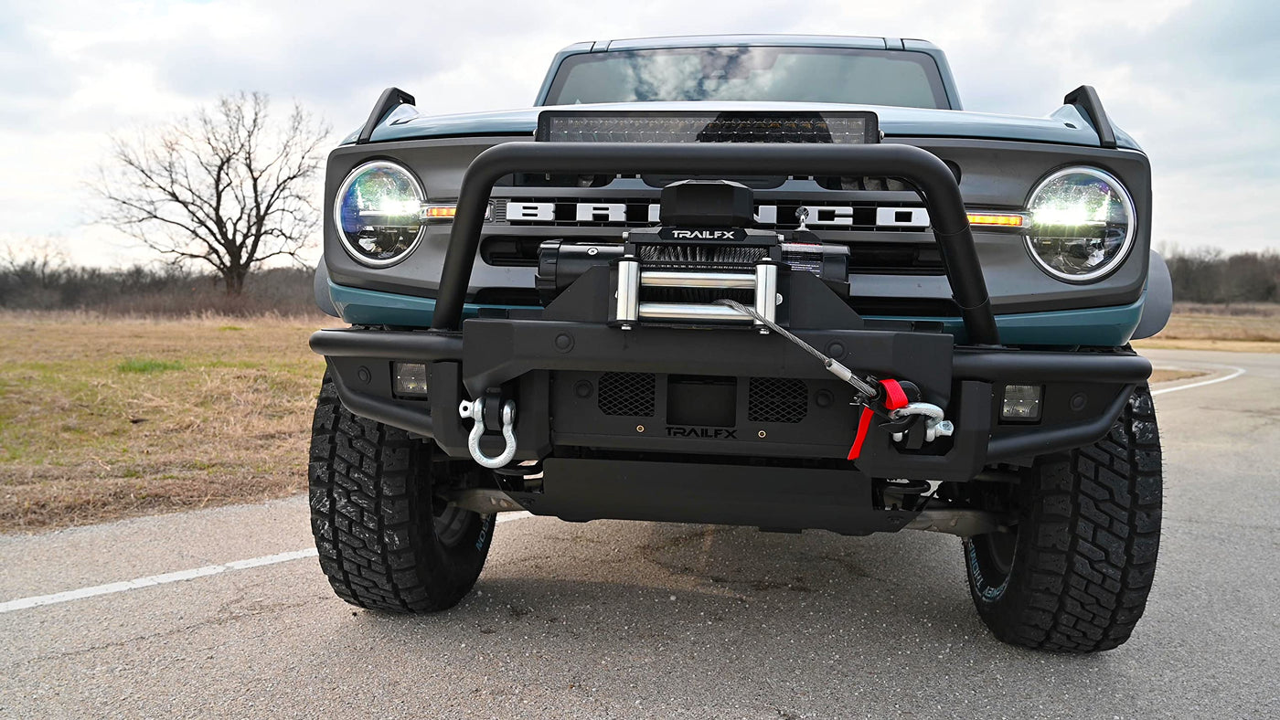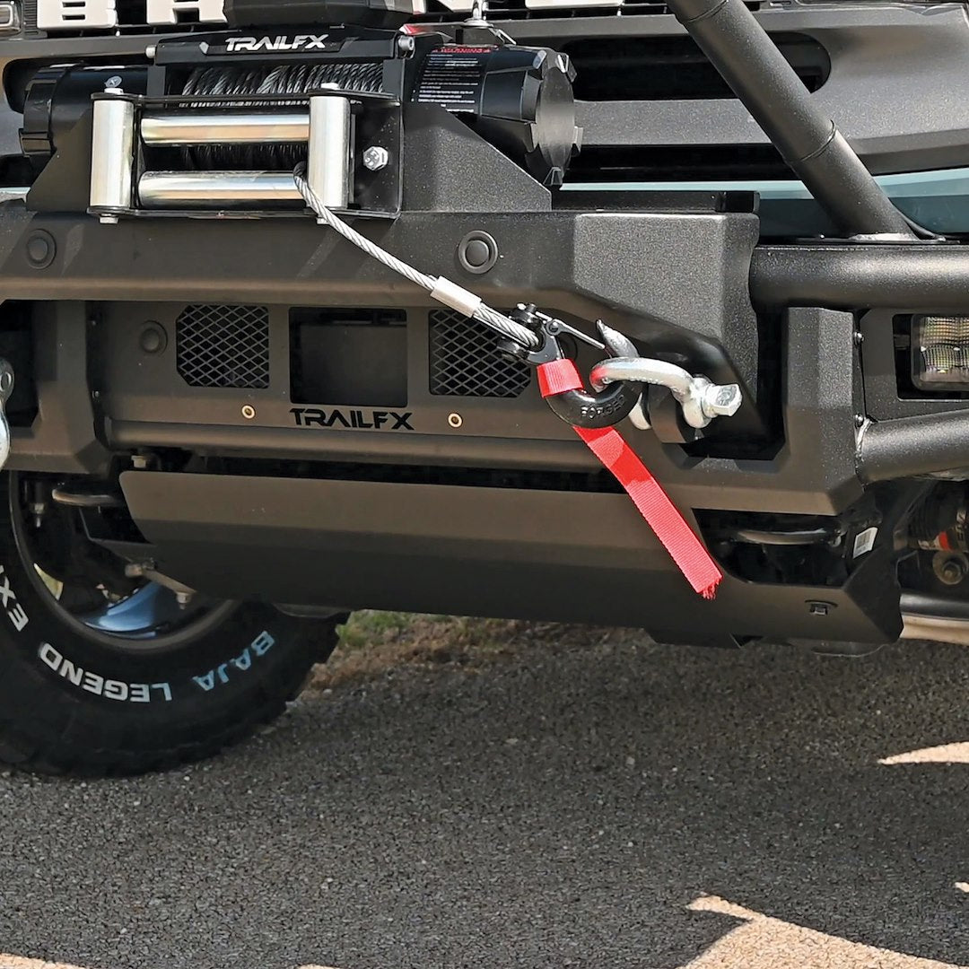 Q: What material is the Trailfx Bronco Front Bumper Skid Plate made of?A: The skid plate is made from high-quality alloy steel, providing excellent durability and resistance to impact, making it ideal for off-road conditions.