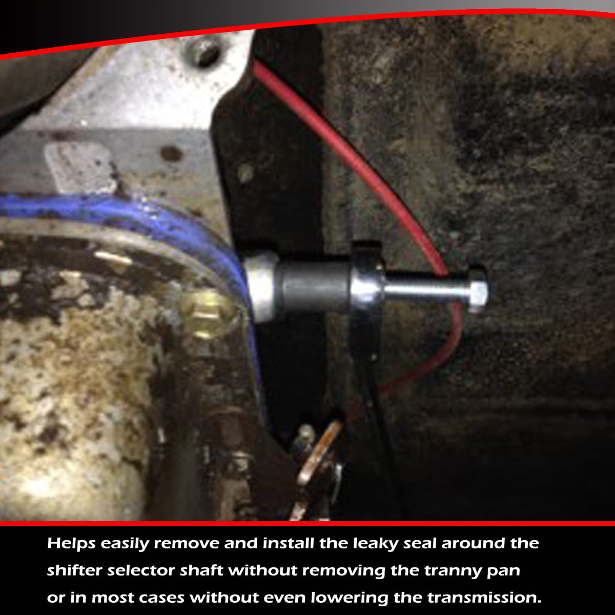 Q: How does the Transmission Shifter Seal Remover work?A: The Transmission Shifter Seal Remover is designed to effectively remove the leaking seal around the shifter selector shaft mechanism without the need to remove the transmission pan or lower the transmission in most cases.