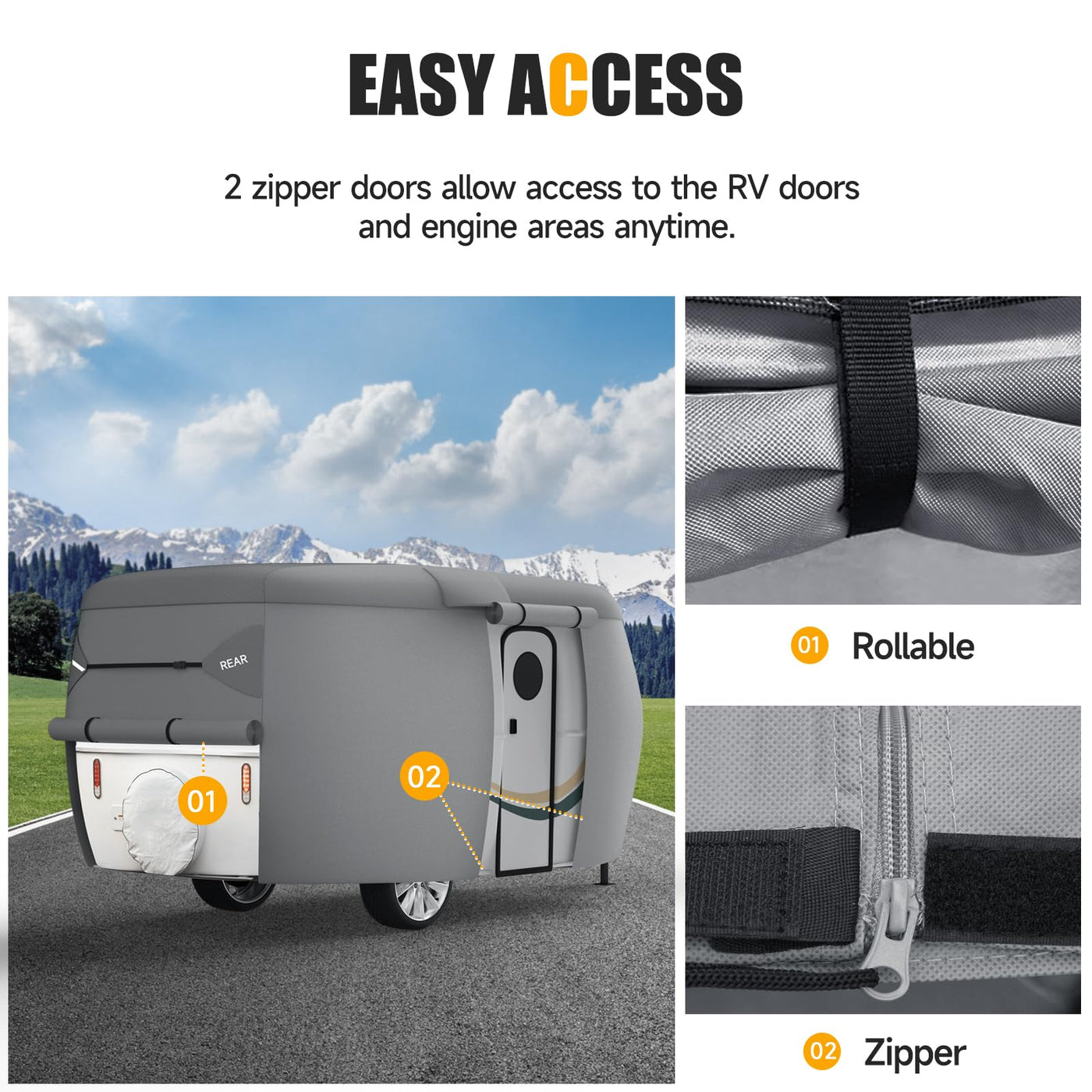 Q: Is the travel trailer cover waterproof and tear-resistant?A: Yes, this cover features a heavy-duty non-woven top with a tear-resistant design, providing reliable waterproof protection against harsh weather elements while safeguarding your trailer from accidental tears or scratches.
