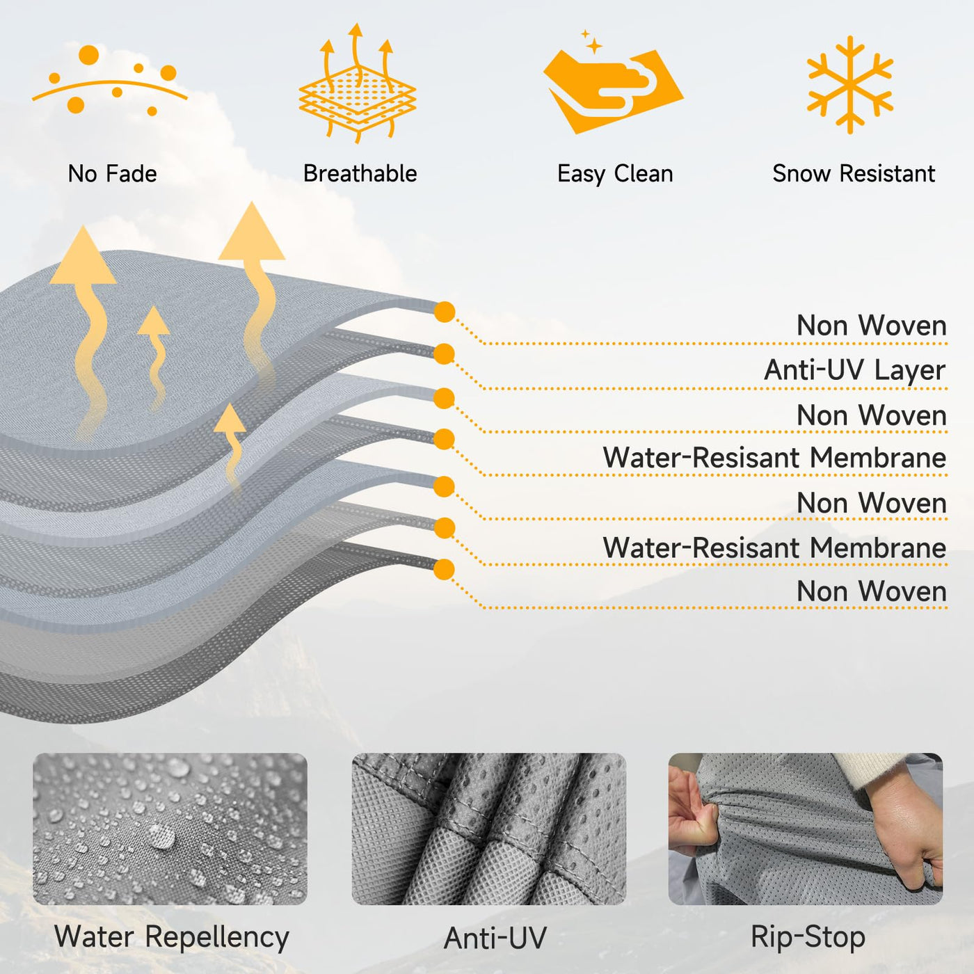 Q: How does the cover promote air circulation?A: The advanced fabric technology used in this cover enhances breathability, promoting air circulation and creating a dry environment that protects your RV trailer from potential water damage.
