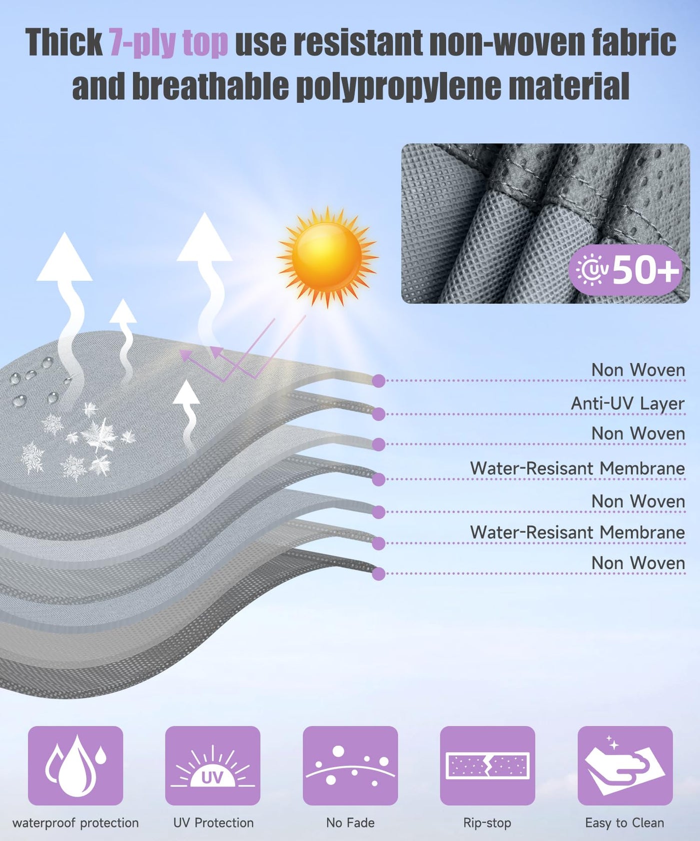 Q: How does the material of the cover protect my RV?A: The cover is made from a thick 7-ply non-woven fabric and breathable polypropylene material that provides excellent protection against bird waste, dust, scratches, and UV rays. It is also windproof, waterproof, and snowproof, ensuring your RV remains safe during harsh weather conditions.