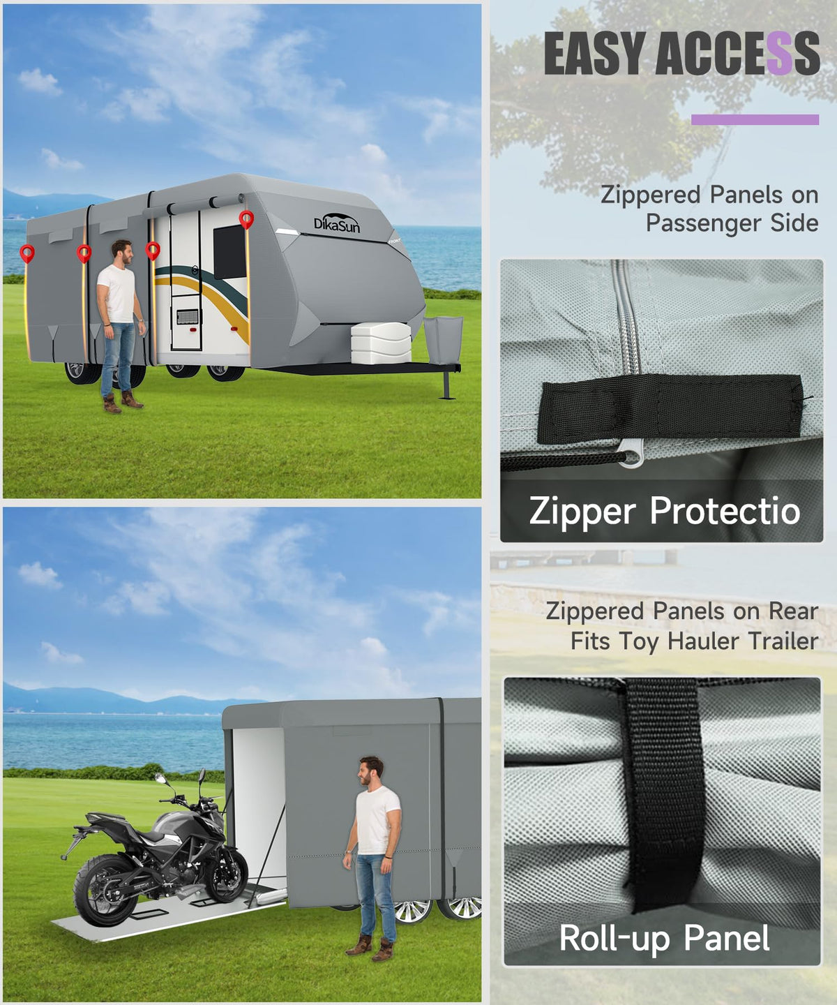 Q: Can I access my RV without removing the entire cover?A: Yes, the DikaSun RV Cover features multiple zippered panels that allow easy access to RV doors and engine areas without the need to remove the entire cover, providing convenience for users.